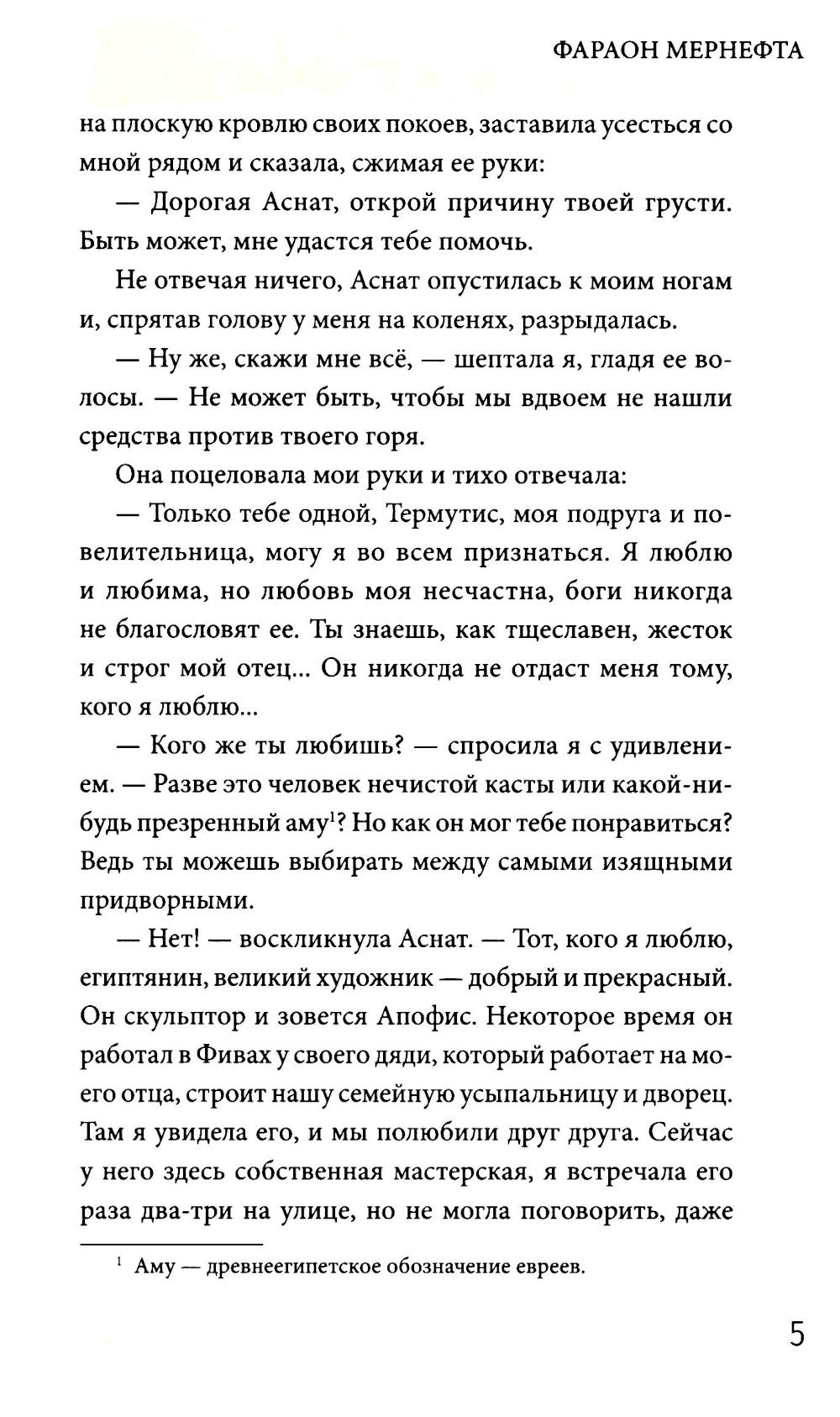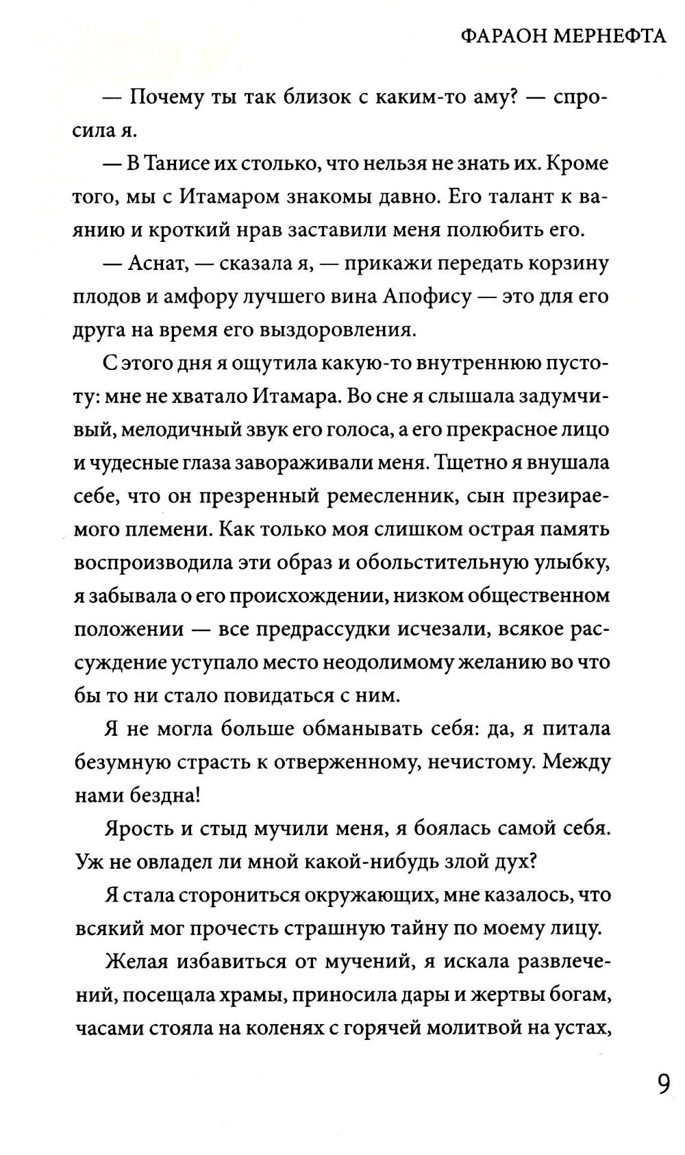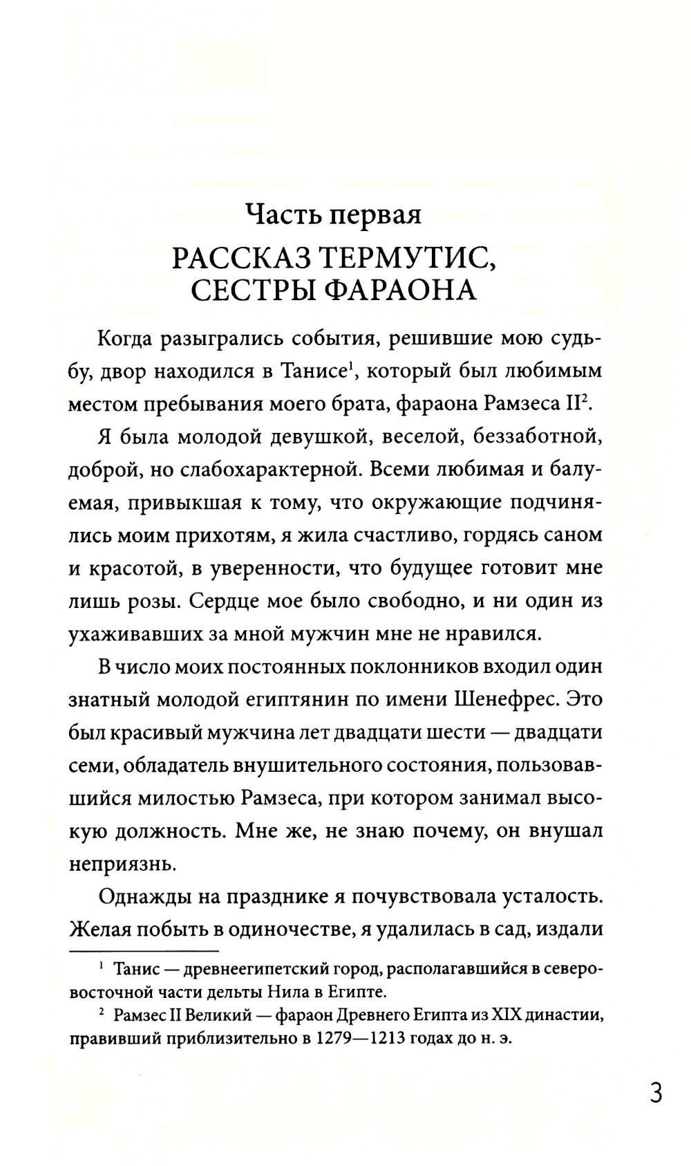 Согласно легенде, именно во времена фараона Мернефты случился исход евреев из Египта, а этот роман - реконструкция известных событий, но не с точки зрения евреев, а с точки зрения египтян. Повествование состоит из трех историй. Одну рассказывает египетская принцесса, заодно раскрывая тайну рождения пророка Моисея. Другую рассказывает молодой египетский маг, который помогал евреям, потому что таким образом надеялся завоевать сердце любимой женщины. Третью рассказывает офицер из гвардии фараона Мернефты, изобличая некоторых египетских аристократов, готовых ради личной выгоды погубить государство. В итоге получается не повторение того, что написано в Библии, а совсем другая книга.| Издательство | Вече |