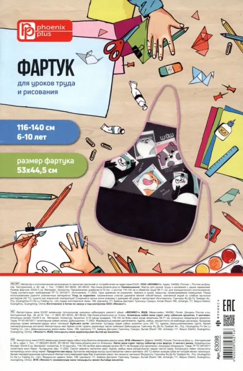 Фартук для уроков труда и рисования (без нарукавников, 53х44.5 см, полиэстер, 2кармана, сублимационная печать, предназначен для девочек 6-10 лет, с ростом 116-140 см и обхватом груди 58-71 см, ПЭТ-пакет).