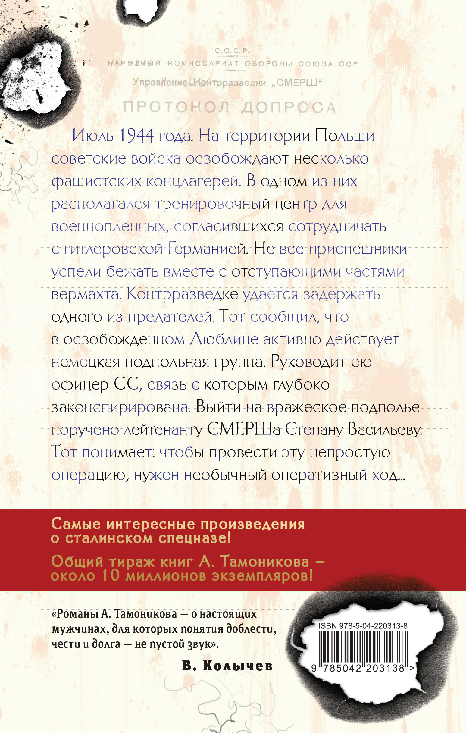Самые интересные романы о сталинском спецназе - СМЕРШе. Июль 1944 года. На территории Польши советские войска освобождают несколько фашистских концлагерей. В одном из них располагался тренировочный центр для военнопленных, согласившихся сотрудничать с гитлеровской Германией. Не все приспешники успели бежать вместе с отступающими частями вермахта. Контрразведке удается задержать одного из предателей. Тот сообщил, что в освобожденном Люблине активно действует немецкая подпольная группа. Руководит ею офицер СС, связь с которым глубоко законспирирована. Выйти на вражеское подполье поручено лейтенанту СМЕРШа Степану Васильеву. Тот понимает: чтобы провести эту непростую операцию, нужен необычный оперативный ход… «Смерть шпионам!» (СМЕРШ) - это короткое и беспощадное название носило особое подразделение НКВД, подчинявшееся И. Сталину. Созданное в годы войны, оно состояло из проверенных в бою, честных и бесстрашных офицеров Красной Армии. СМЕРШа боялись все - и фашистские лазутчики, готовящие диверсии в наших боевых порядках, и гитлеровские приспешники, действующие в глубоком советском тылу. Враг знал: если на его след напали бойцы сталинского спецназа, справедливого и скорого суда не избежать. Романы серии «СМЕРШ - спецназ Сталина» - это каждый раз увлекательный динамичный сюжет и новые исторические знания, это экшен, написанный простым и понятным языком. Общий тираж книг А. Тамоникова - более 10 миллионов экземпляров! «Романы А. Тамоникова - о настоящих мужчинах, для которых понятия доблести, чести и долга - не пустой звук». - В. Колычев| Издательство | ООО "Издательство "Эксмо" |
