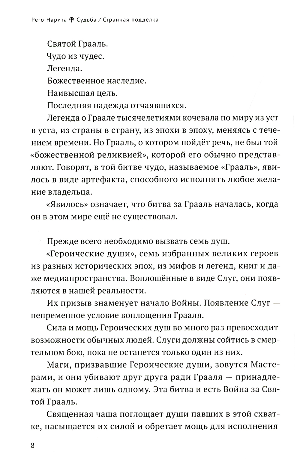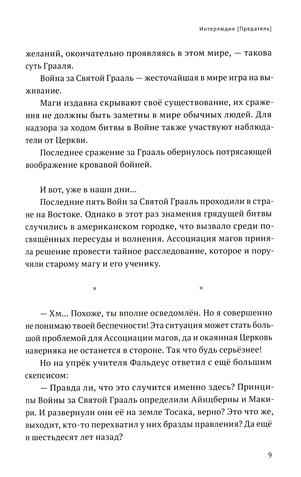 Война за Святой Грааль - грандиозная битва, в которой маги призывают Героические души и сражаются за обладание Святым Граалем, способным выполнить любое желание победителя. Последняя, Пятая Война, состоялась в Японии. Но несколько лет спустя на западе Америки, в городке Сноуфилд, начинается новая… Фальшивая Война за Святой Грааль. Маги и Героические души продолжают сражаться не на жизнь, а на смерть, даже понимая, что вся эта битва - всего лишь фальшивка. Ведь истина и ложь - две стороны одной медали… Они бьются не только за Грааль - каждый из участников воюет за свою правду. Чем же заполнится сосуд? Истиной или же…| Издательство | ИД Истари Комикс |