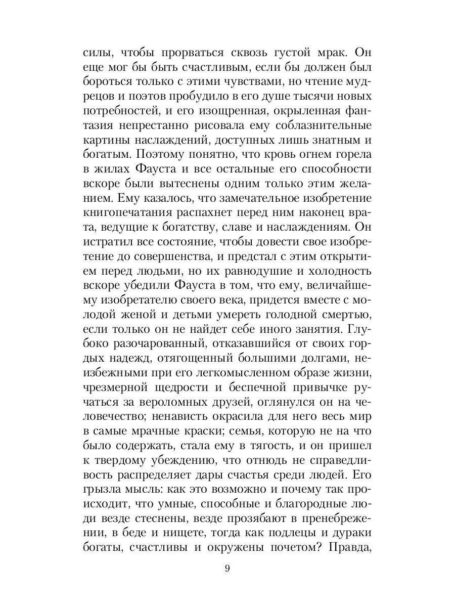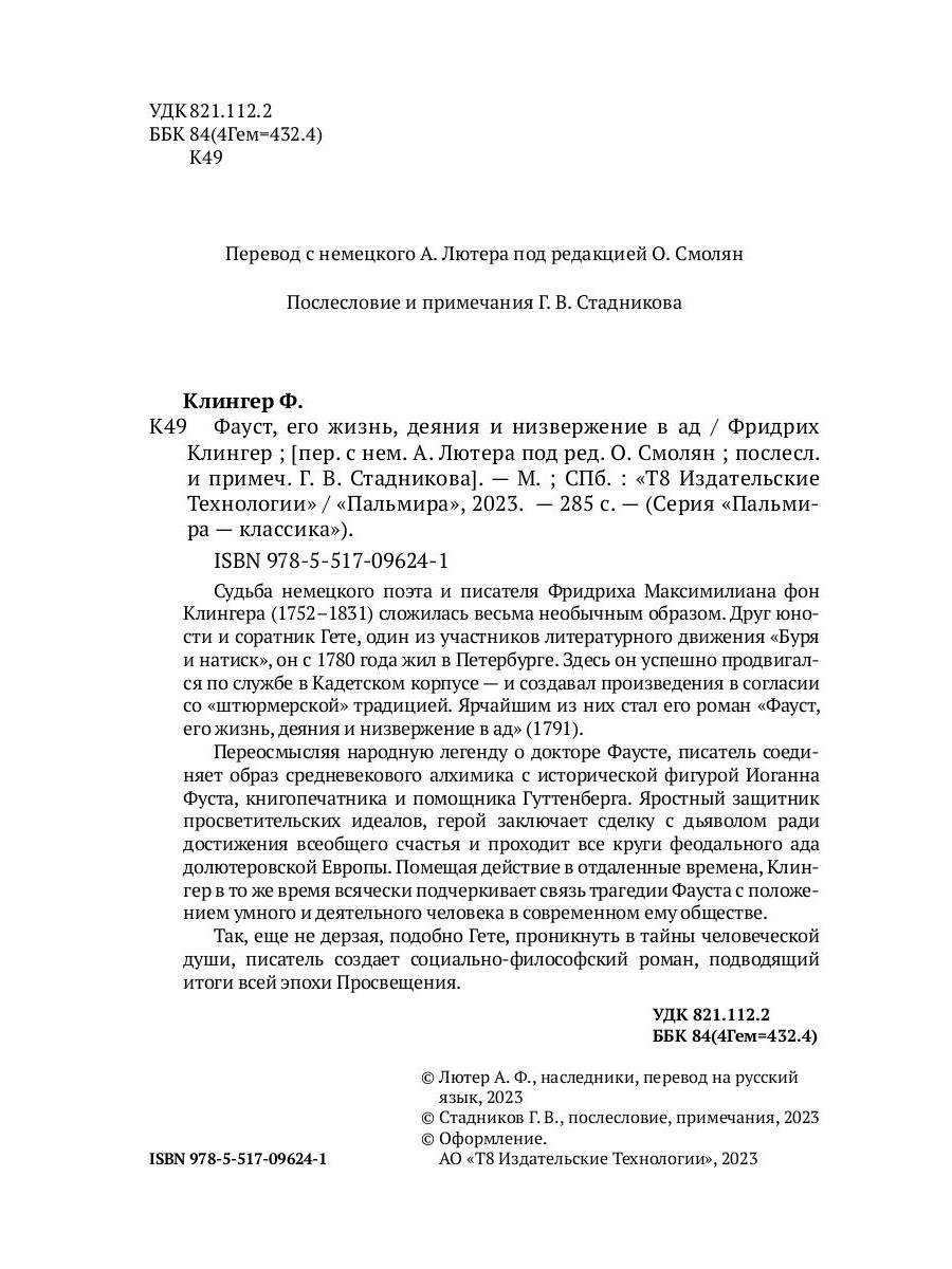 Судьба немецкого поэта и писателя Фридриха Максимилиана фон Клингера (1752-1831) сложилась весьма необычным образом. Друг юности и соратник Гете, один из участников литературного движения "Буря и натиск", он с 1780 года жил в Петербурге. Здесь он успешно продвигался по службе в Кадетском корпусе - и создавал произведения в согласии со "штюрмерской" традицией. Ярчайшим из них стал его роман "Фауст, его жизнь, деяния и низвержение в ад" (1791). Переосмысляя народную легенду о докторе Фаусте, писатель соединяет образ средневекового алхимика с исторической фигурой Иоганна Фуста, книгопечатника и помощника Гуттенберга. Яростный защитник просветительских идеалов, герой заключает сделку с дьяволом ради достижения всеобщего счастья и проходит все круги феодального ада долютеровской Европы. Помещая действие в отдаленные времена, Клингер в то же время всячески подчеркивает связь трагедии Фауста с положением умного и деятельного человека в современном ему обществе. Так, еще не дерзая, подобно Гете, проникнуть в тайны человеческой души, писатель создает социально-философский роман, подводящий итоги всей эпохи Просвещения.| Издательство | Т8 RUGRAM |