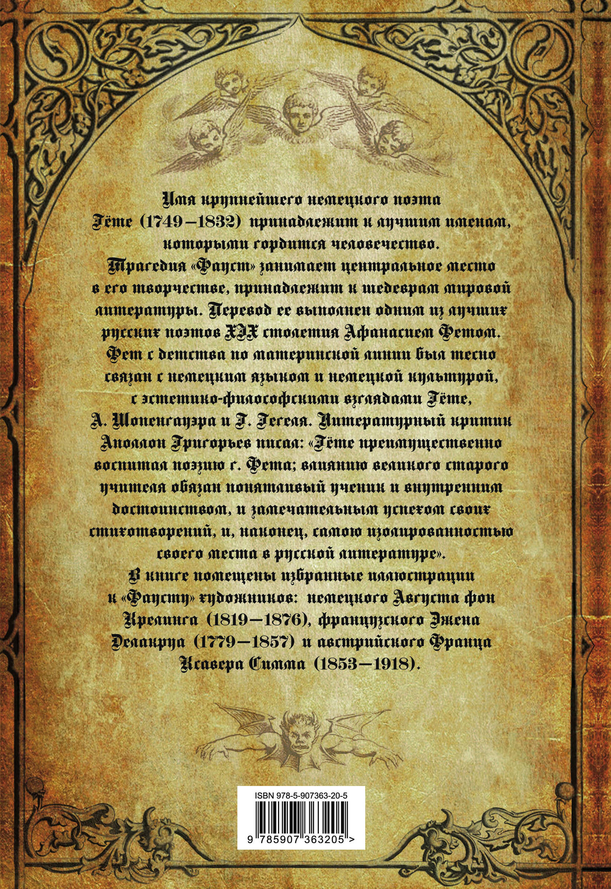 Имя крупнейшего немецкого поэта Гете (1749-1832) принадлежит к лучшим именам, которыми гордится человечество. Трагедия «Фауст» занимает центральное место в его творчестве, принадлежит к шедеврам мировой литературы. Перевод ее выполнен одним из лучших русских поэтов XIX столетия Афанасием Фетом. Фет с детства по материнской линии был тесно связан с немецким языком и немецкой культурой, с эстетико-философскими взглядами Гете, А. Шопенгауэра и Г. Гегеля. Литературный критик Аполлон Григорьев писал: «Гете преимущественно воспитал поэзию г. Фета; влиянию великого старого учителя обязан понятливый ученик и внутренним достоинствам, и замечательным успехом своих стихотворений, и, наконец, самою изолированностью своего места в русской литературе». В книге помещены избранные иллюстрации к «Фаусту» художников: немецкого Августа фон Крелинга (1819-1876) и французского Эжена Делакруа (1779-1857) и австрийского Франца Ксавера Симма (1853-1918).| Издательство | Агентство Алгоритм ООО |