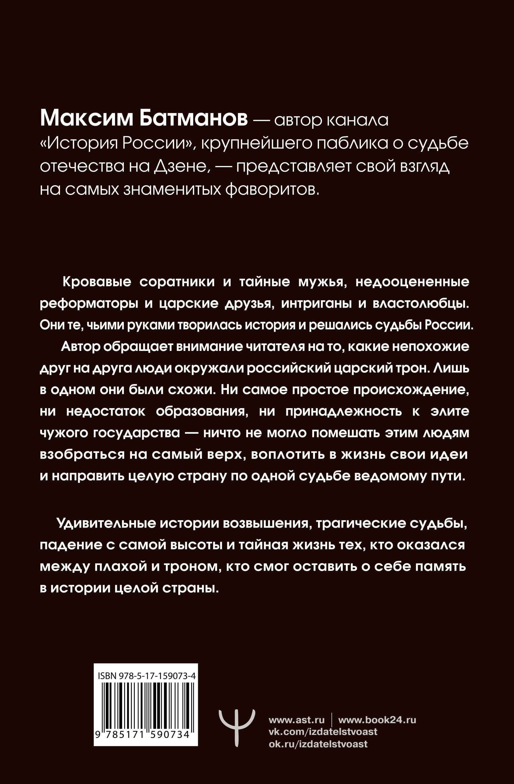 Максим Батманов, автор канала об отечественной истории, крупнейшего на площадке Дзен, представляет свой взгляд на знаменитых исторических деятелей. Фавориты. Любимцы царей, возлюбленные императриц, доверенные лица императоров и вождей. Кровавые соратники Скуратов и Берия. Недооцененные реформаторы Аракчеев и Голицын. Тайные мужья Потемкин и Разумовский. Властолюбцы Никон и Бирон. Царские друзья Меншиков и Распутин. Они развязывали войны, подбивали властителей на реформы, вступали в конфликты с целым царским двором, обогащались и отказывались от даров. Непростые истории возвышения, трагические судьбы, падение с самой высоты и тайная жизнь тех, кто жил между плахой и троном, кто смог оставить о себе память в жизни целой страны.| Издательство | Издательство "АСТ" |
