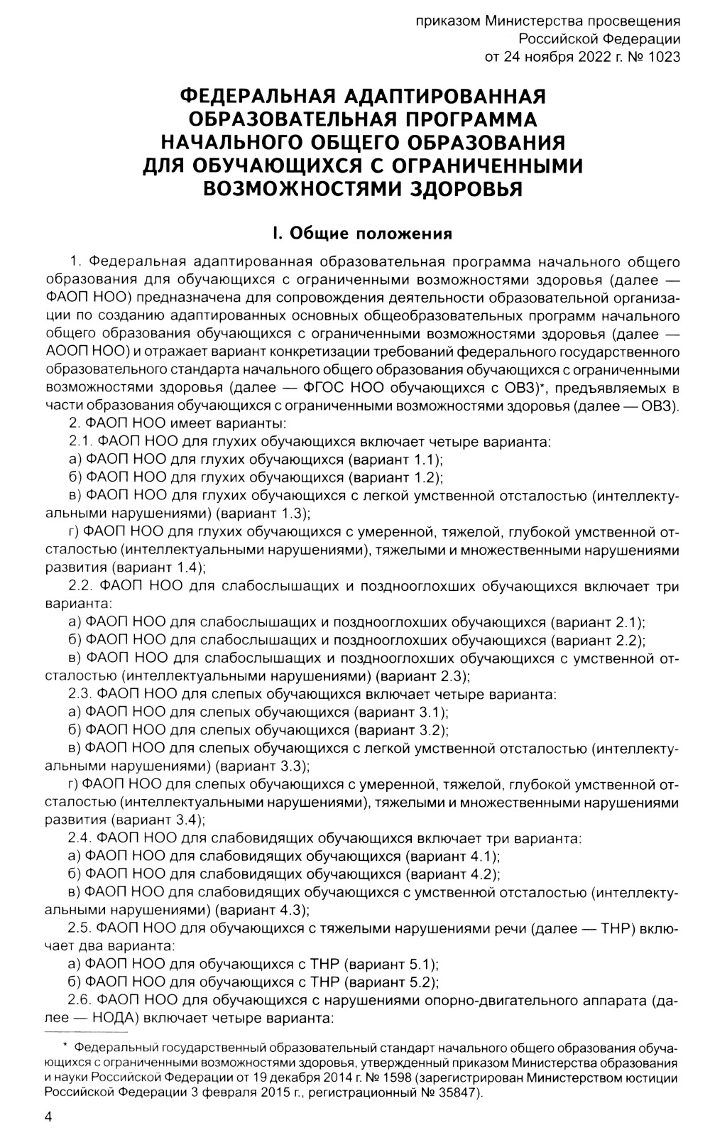 Настоящее издание содержит текст Федеральной адаптированной образовательной программы начального общего образования для обучающихся с ограниченными возможностями здоровья (ФАОП НОО), утвержденной Приказом Министерства просвещения Российской Федерации от 24 ноября 2022 г. № 1023. ФАОП НОО предназначена для сопровождения деятельности образовательной организации по созданию адаптированных основных общеобразовательных программ начального общего образования обучающихся с ограниченными возможностями здоровья (АООП НОО) и отражает вариант конкретизации требований федерального государственного образовательного стандарта начального общего образования обучающихся с ограниченными возможностями здоровья (ФГОС НОО обучающихся с ОВЗ), утвержденной Приказом Министерства просвещения Российской Федерации от 24 ноября 2022 г. № 1022.| Издательство | Творческий центр Сфера |