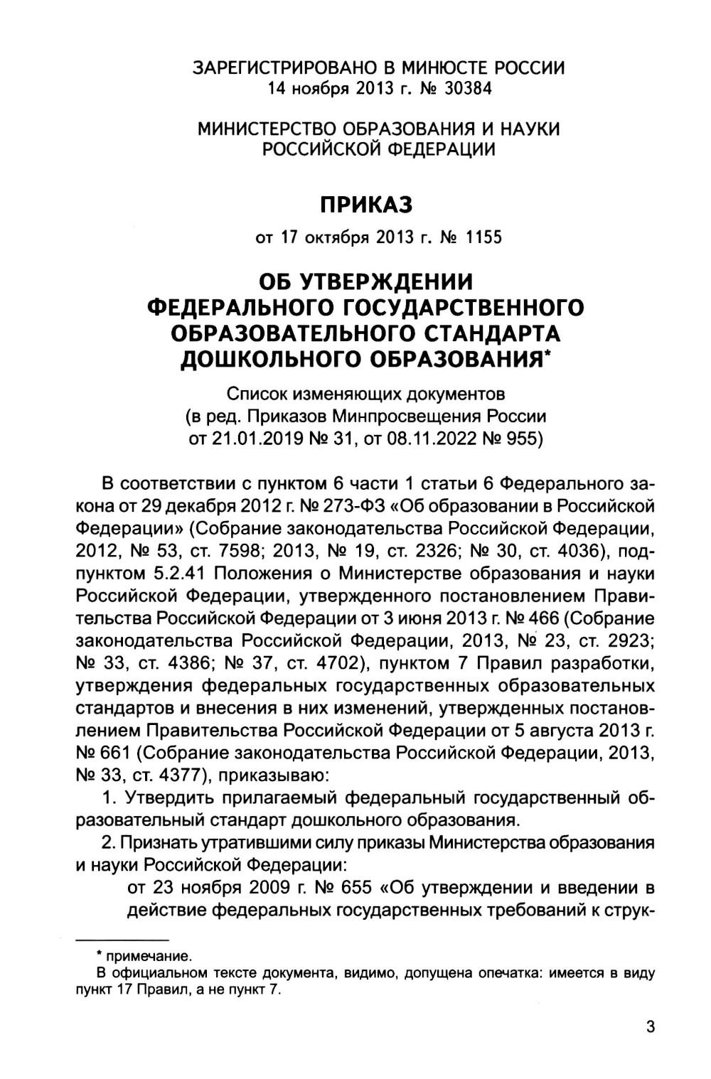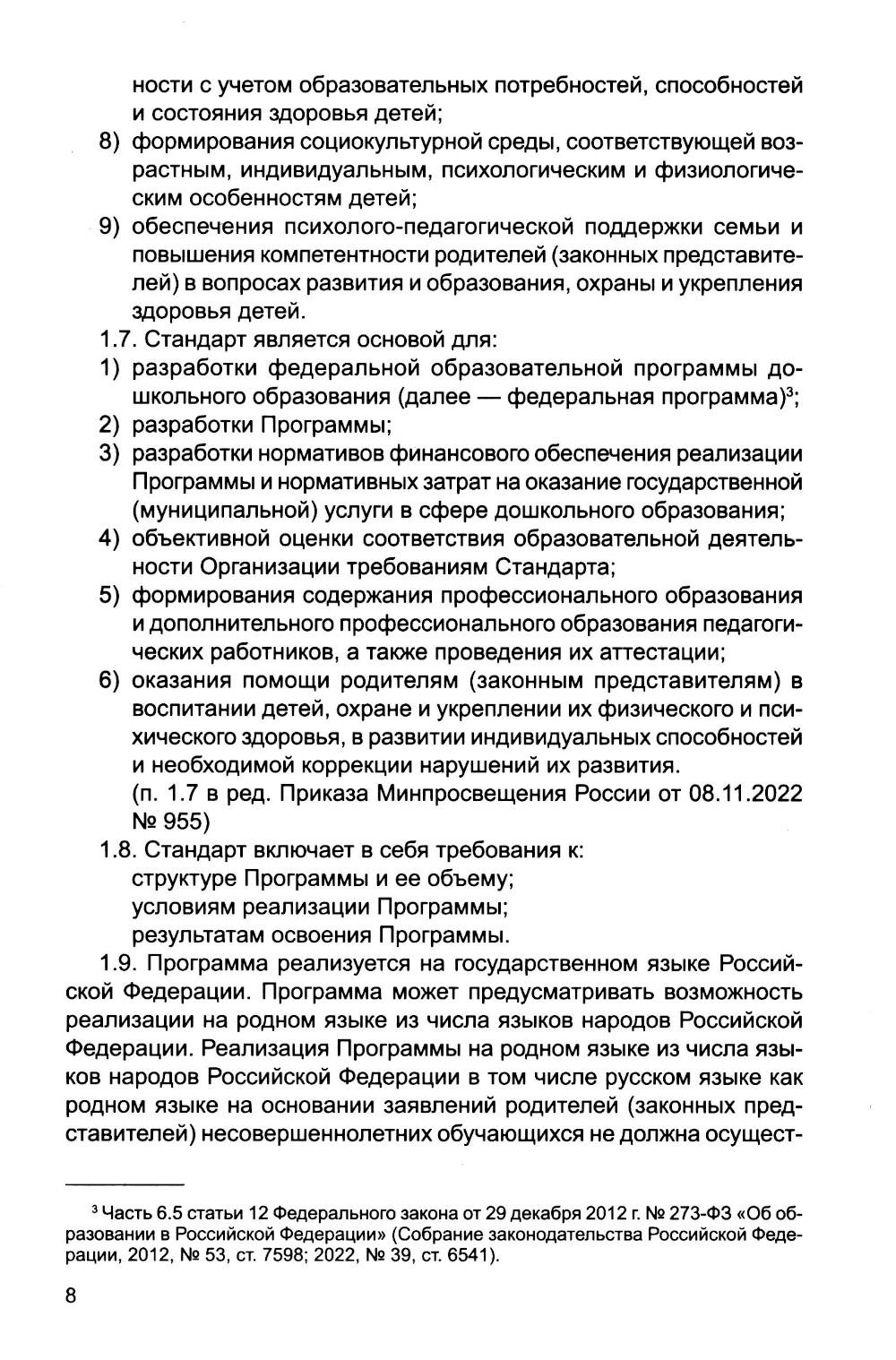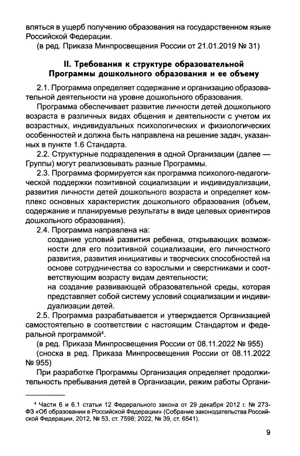 Настоящее издание содержит текст Федерального государственного образовательного стандарта дошкольного образования, утвержденного Приказом Минобрнауки РФ от 17 октября 2013 г. № 1155 с изменениями и дополнениями, внесенными Приказами Минпросвещения России от 21.01.2019 № 31, от 08.11.2022 № 955, вступившими в силу в 2023 г.| Издательство | Творческий центр Сфера |