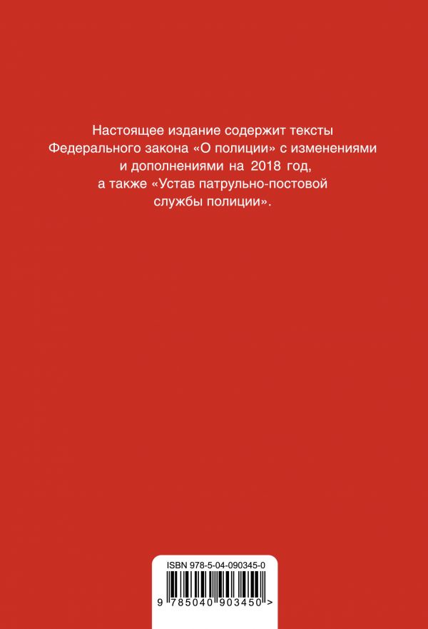 Настоящее издание содержит тексты Федерального закона от 7 февраля 2011 года №?3-ФЗ "О полиции" с изменениями на 2018 год. А также Устав патрульно-постовой службы полиции. Если есть изменения, вступающие в силу позднее, то вместе с редакцией нормы, действующей на эту дату, приводится норма в новой редакции и указывается дата, с которой она вступает в силу.