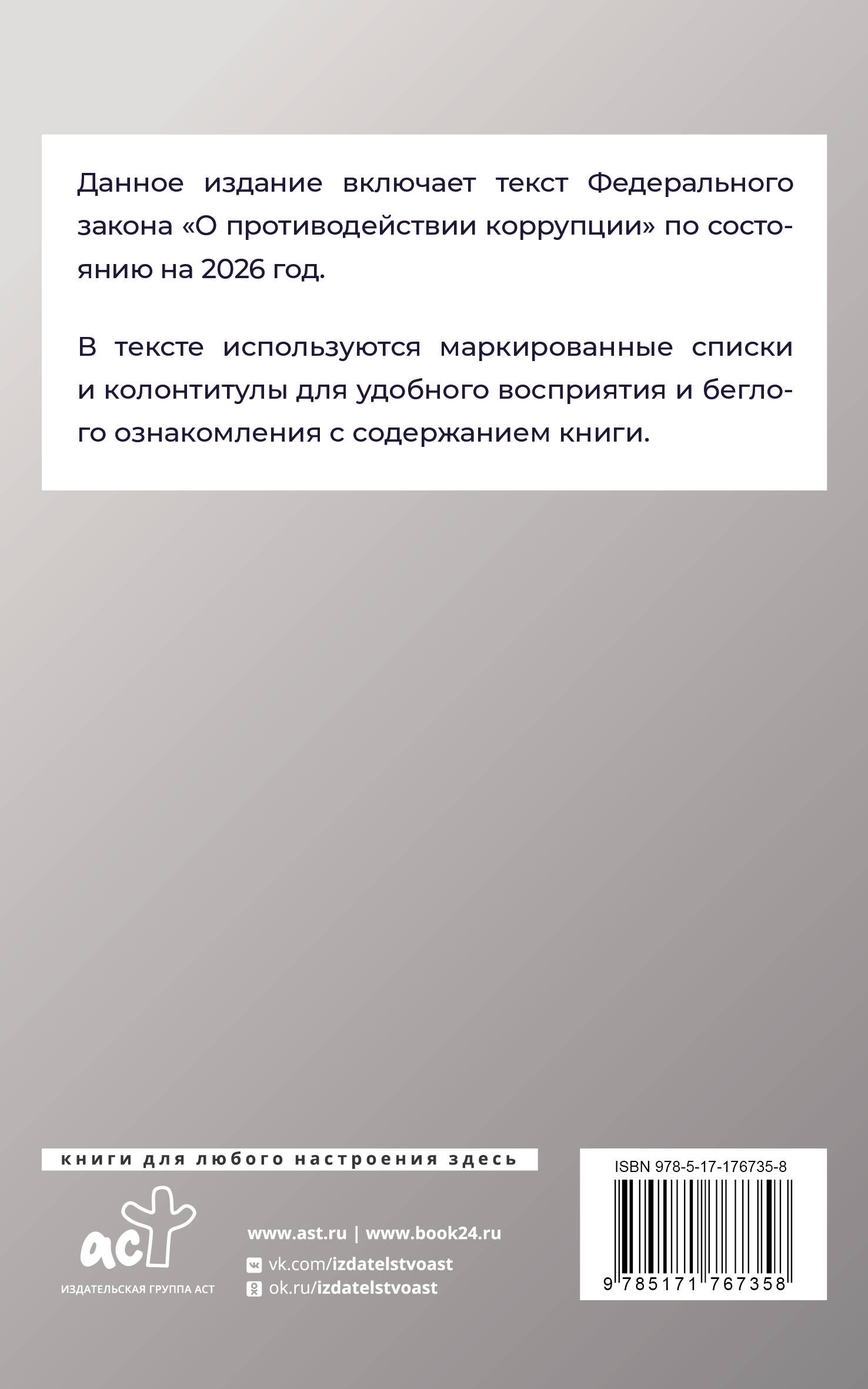 Данное издание включает текст Федерального закона «О противодействии коррупции» на 2026 год. В тексте используются маркированные списки и колонтитулы для удобного восприятия и беглого ознакомления с содержанием книги. Издание учитывает все изменения, опубликованные в официальных источниках на момент подписания издания в печать.| Издательство | Издательство "АСТ" |
