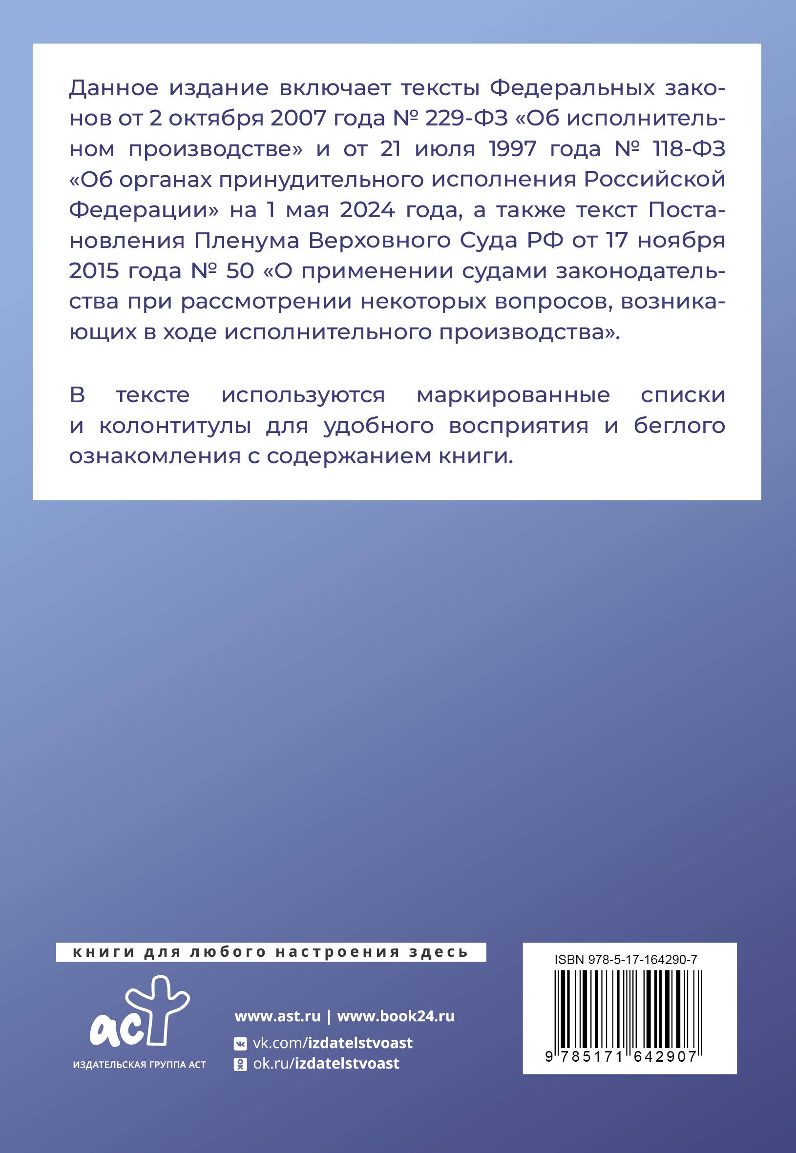 Данное издание включает тексты Федеральных законов от 2 октября 2007 года № 229-ФЗ "Об исполнительном производстве" и от 21 июля 1997 года № 118-ФЗ "Об органах принудительного исполнения Российской Федерации" на 1 мая 2024 года, а также текст Постановления Пленума Верховного Суда РФ от 17 ноября 2015 года № 50 "О применении судами законодательства при рассмотрении некоторых вопросов, возникающих в ходе исполнительного производства". В тексте используются маркированные списки и колонтитулы для удобного восприятия и беглого ознакомления с содержанием книги. Издание учитывает все изменения, опубликованные в официальных источниках на момент подписания издания в печать.