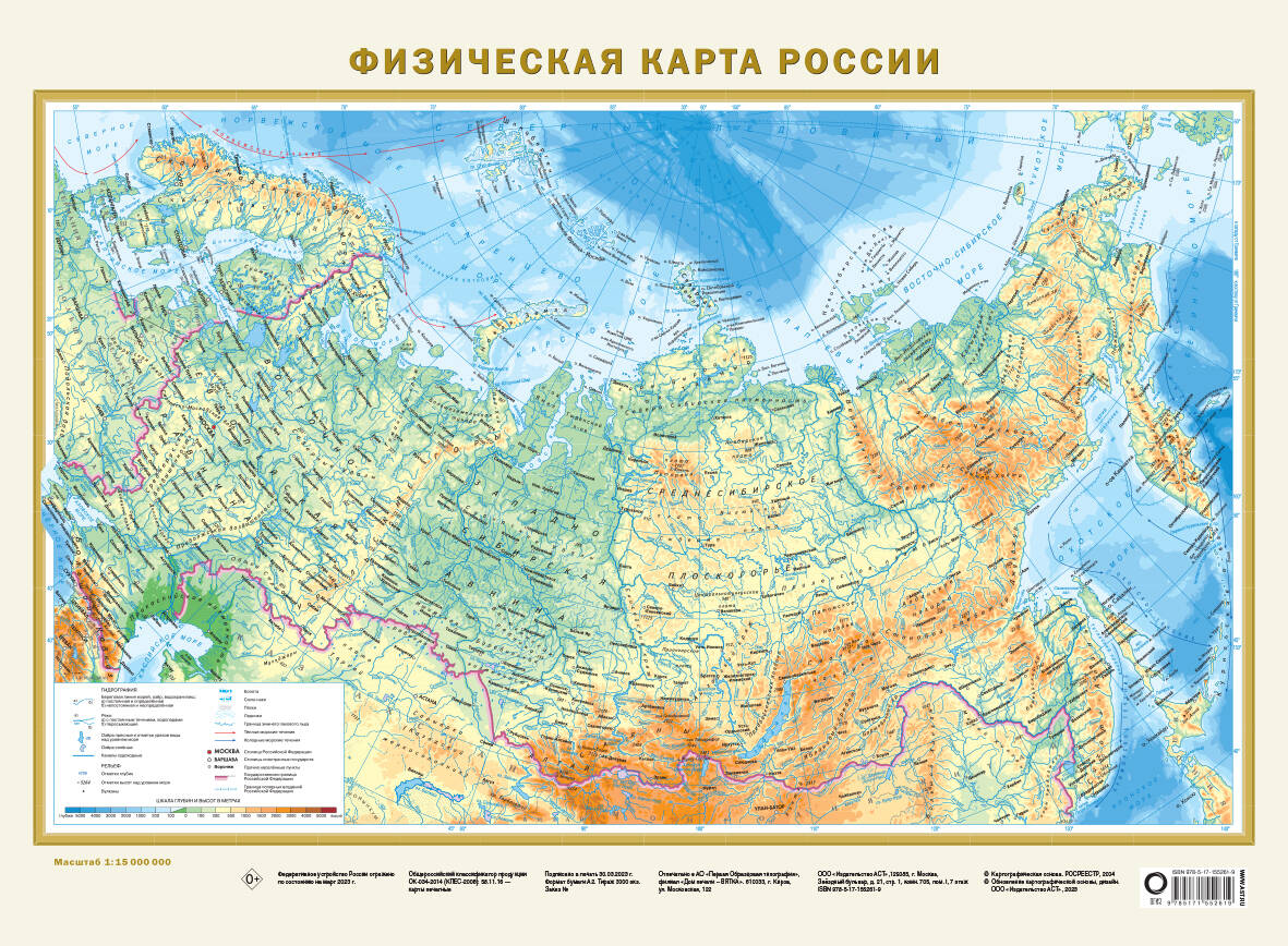 Двухсторонняя покрытая полимерной плёнкой карта имеет размеры 575х420 мм. На ней представлены две карты России в масштабе 1:15 000 000 (в 1 см 150 км) - Физическая карта России и карта "Федеративное устройство России". На Физической карте с помощью цветовой шкалы высот и глубин наглядно отражёно чередование различных типов и форм рельефа на территории России и прилегающих государств. Пунсонами с высотными отметками показаны наиболее высокие вершины основных горных систем. Достаточно подробно дана гидрологическая сеть (реки, болота, озёра, водохранилища). В морях, окружающих Россию, показаны тёплые и холодные течения, а также граница зимнего пакового льда. На обновлённой карте России представлены все 89 субъектов Российской Федерации, включая Республику Крым и Севастополь, Донецкую и Луганскую народные республики, Запорожскую и Херсонскую области, с их столицами и центрами. Субъекты РФ сгруппированы по 8 федеральным округам. Показаны магистральные пути железнодорожного и автомобильного сообщения. Карта упакована в прозрачный рукав из ПВХ. Размеры упаковки: длина 420 мм, диаметр 45 мм. Рекомендовано для широкого круга пользователей.| Издательство | ИЗДАТЕЛЬСТВО "АСТ" |