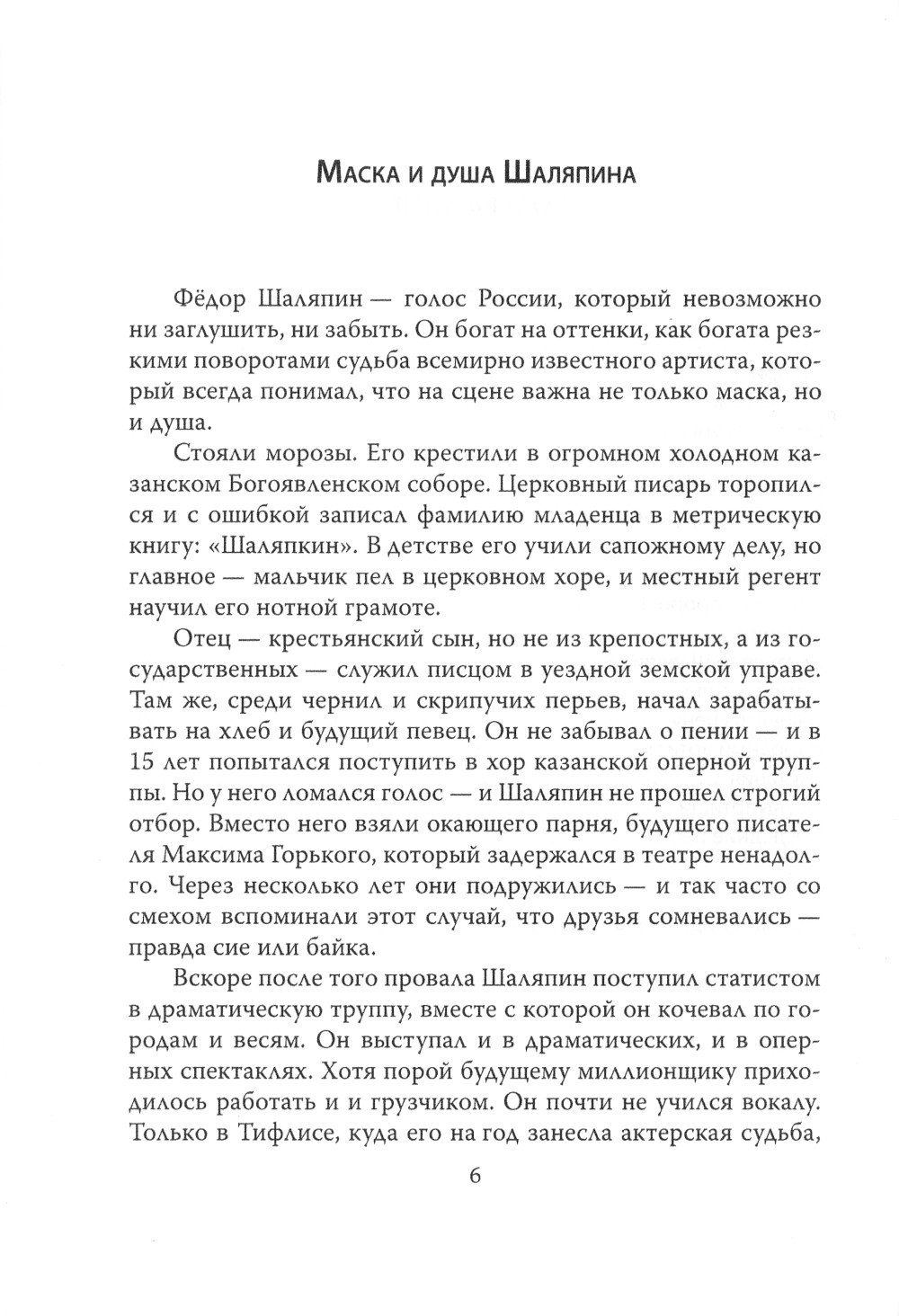 Перед вами главная книга о главном русском певце, 150-летний юбилей которого мы празднуем в этом году. Не поняв и не полюбив Шаляпина, невозможно понять Россию. Писатель Лев Никулин не только рассказывает о жизни Шаляпина, но и раскрывает феномен великого певца, ставшего сокровенным голосом народа. В этой книге собраны не легенды, не слухи, а документальная правда из первых уст. Взлет Шаляпина, секреты его актерского мастерства, лучшие роли великого мастера - все это есть в книге, которую вы держите в руках