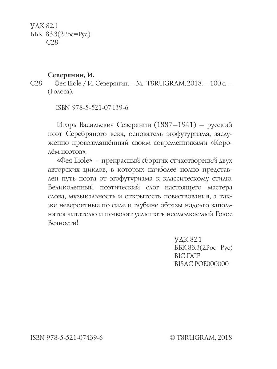 Игорь Васильевич Северянин (1887-1941) - русский поэт Серебряного века, основатель эгофутуризма, заслуженно провозглашённый своим современниками «Королём поэтов». «Фея Eiole» - прекрасный сборник стихотворений двух авторских циклов, в которых наиболее полно представлен путь поэта от эгофутуризма к классическому стилю. Великолепный поэтический слог настоящего мастера слова, музыкальность и открытость повествования, а также невероятные по силе и глубине образы надолго запомнятся читателю и позволят услышать несмолкаемый Голос Вечности!| Издательство | Т8 RUGRAM |