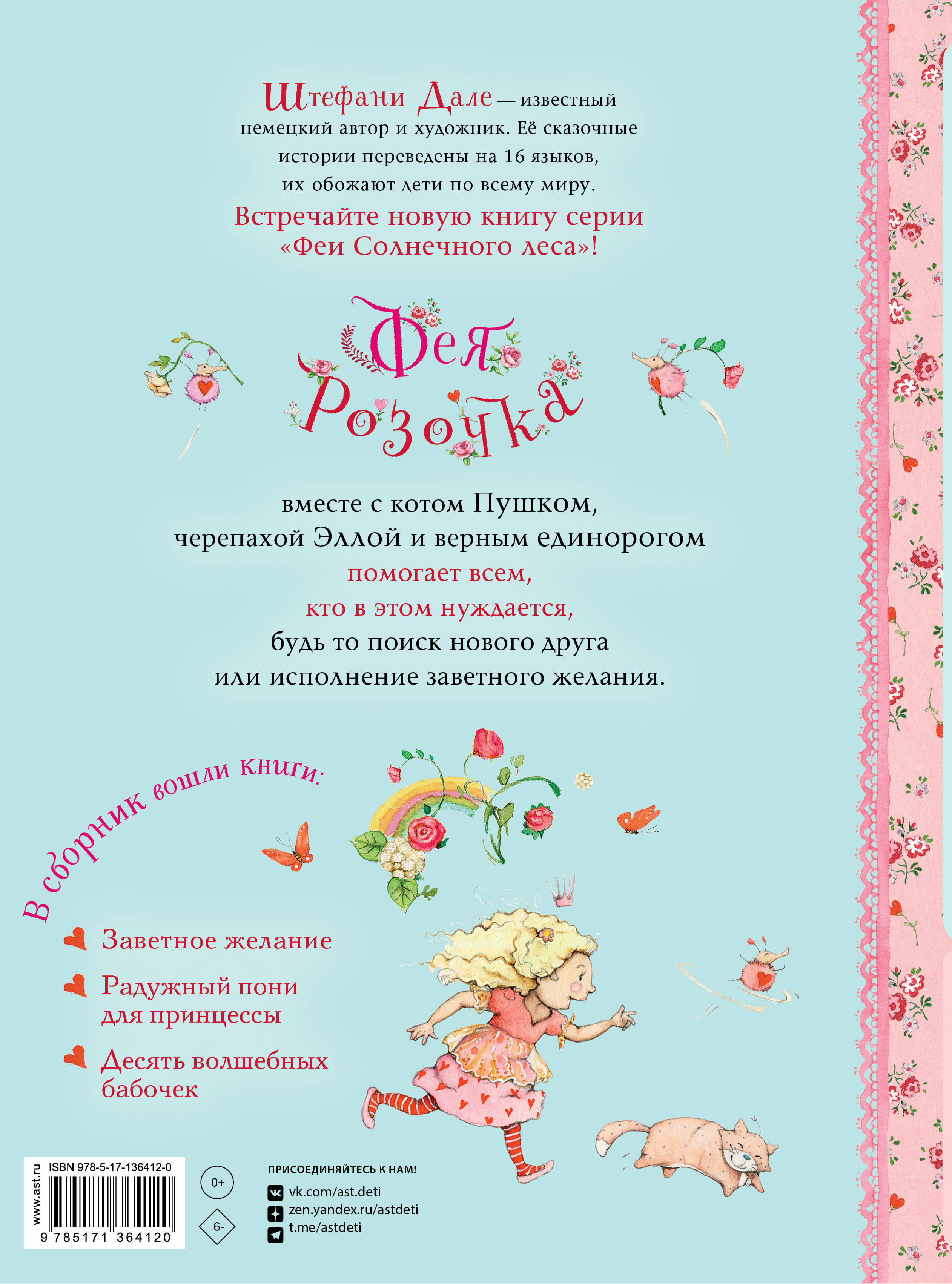 Сказочная принцесса фея Розочка живёт в замке и умеет исполнять самые заветные желания. Ей на помощь всегда приходят верные друзья: кот Пушок, черепаха Элла и белоснежный единорог. Вместе они отправятся на поиски подарка для принцессы Сисси и отыщут друга для маленькой шоколадной белочки. В сборник вошли истории "Фея Розочка. Заветное желание", "Фея Розочка. Радужный пони для принцессы", "Фея Розочка. Десять волшебных бабочек".| Издательство | ИЗДАТЕЛЬСТВО "АСТ" |