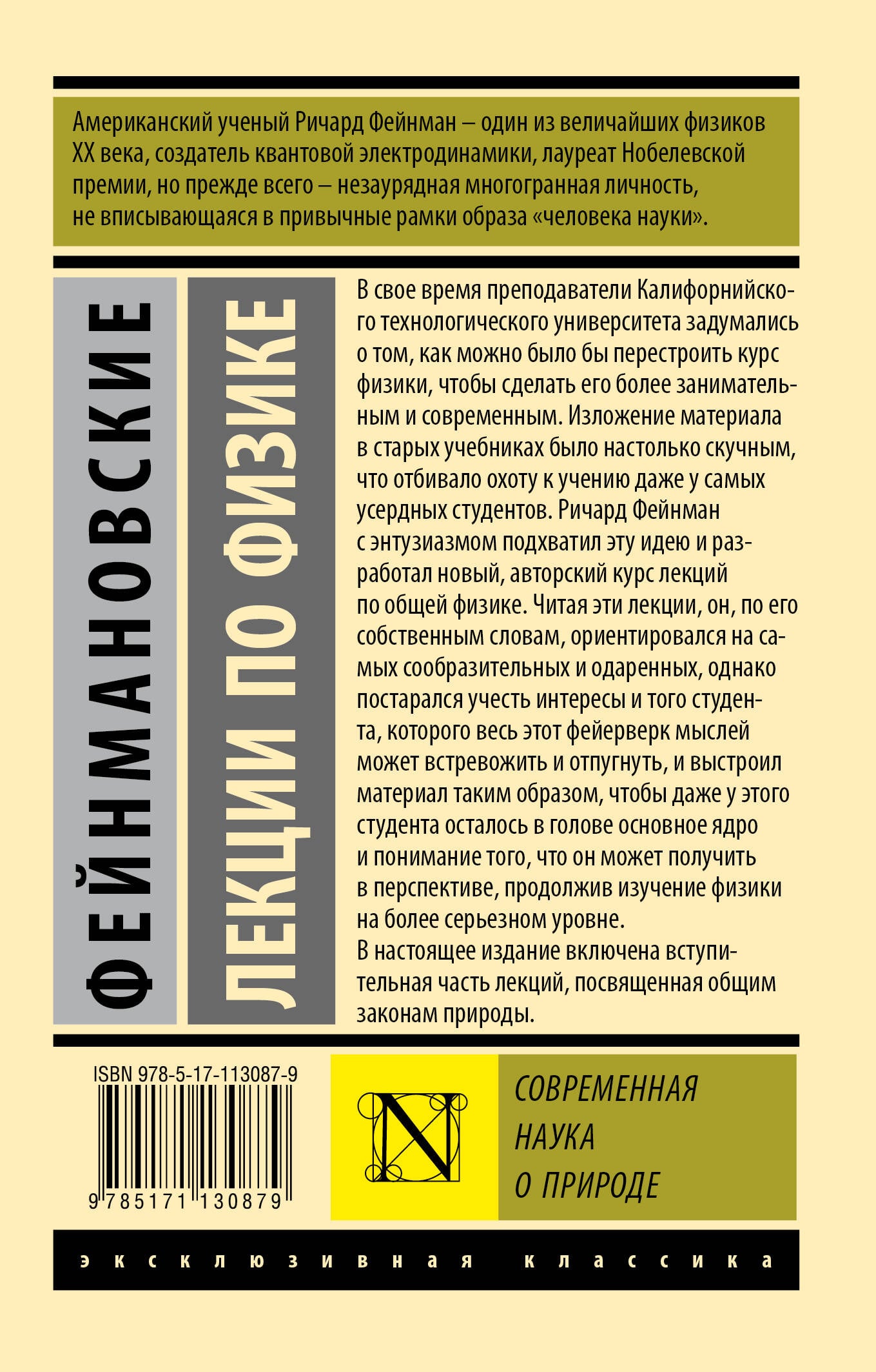 Американский физик Ричард Фейнман - один из величайших физиков ХХ века, создатель квантовой электродинамики, лауреат Нобелевской премии, но, прежде всего, - незаурядная многогранная личность, не вписывающаяся в привычные рамки образа "человека науки". В свое время преподаватели Калифорнийского технологического университета задумались о том, как можно было бы перестроить курс физики, чтобы сделать его более занимательным и современным. Изложение материала в старых учебниках было настолько скучным, что отбивало охоту к учению даже у самых усердных студентов. Ричард Фейнман с энтузиазмом подхватил эту идею и разработал новый, авторский курс лекций по общей физике. Читая эти лекции, он, по его собственным словам, ориентировался на самых сообразительных и одаренных, однако постарался учесть интересы и того студента, которого весь этот фейерверк мыслей может встревожить и отпугунуть, и выстроил материал таким образом, чтобы даже у этого студента осталось в голове основное ядро и понимание того, что он может получить в перспективе, продолжив изучение физики на более серьезном уровне. В настоящее издание включена первая, вступительная часть лекций, посвященная общим законам природы.| Издательство | ИЗДАТЕЛЬСТВО "АСТ" |
