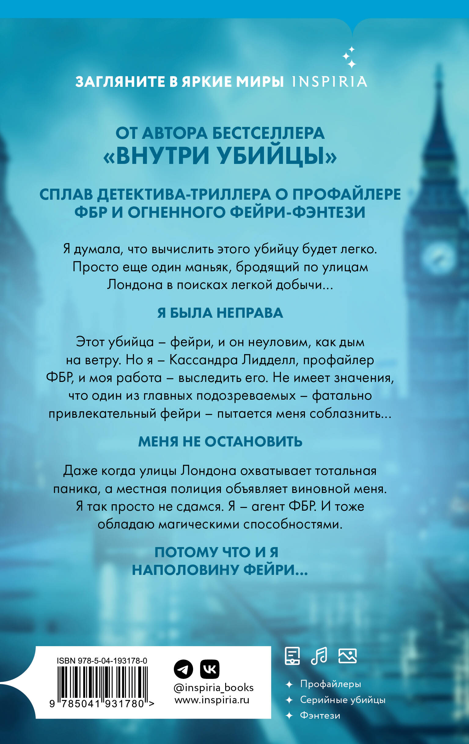 ОТ АВТОРА БЕСТСЕЛЛЕРА «ВНУТРИ УБИЙЦЫ». СПЛАВ ДЕТЕКТИВА-ТРИЛЛЕРА О ПРОФАЙЛЕРЕ ФБР И ОГНЕННОГО ФЕЙРИ-ФЭНТЕЗИ. Фейри живут среди нас. И один из них - серийный убийца… Я думала, что вычислить этого убийцу будет легко. Просто еще один маньяк, бродящий по улицам Лондона в поисках легкой добычи… Я БЫЛА НЕ ПРАВА. Этот убийца - фейри, и он неуловим, как дым на ветру. Но я - Кассандра Лидделл, профайлер ФБР, и моя работа - выследить его. Не имеет значения, что один из главных подозреваемых - фатально привлекательный фейри - пытается меня соблазнить… МЕНЯ НЕ ОСТАНОВИТЬ. Даже когда улицы Лондона охватывает тотальная паника, а местная полиция объявляет виновной меня. Я так просто не сдамся. Я - агент ФБР. И тоже обладаю магическими способностями. ПОТОМУ ЧТО И Я НАПОЛОВИНУ ФЕЙРИ…