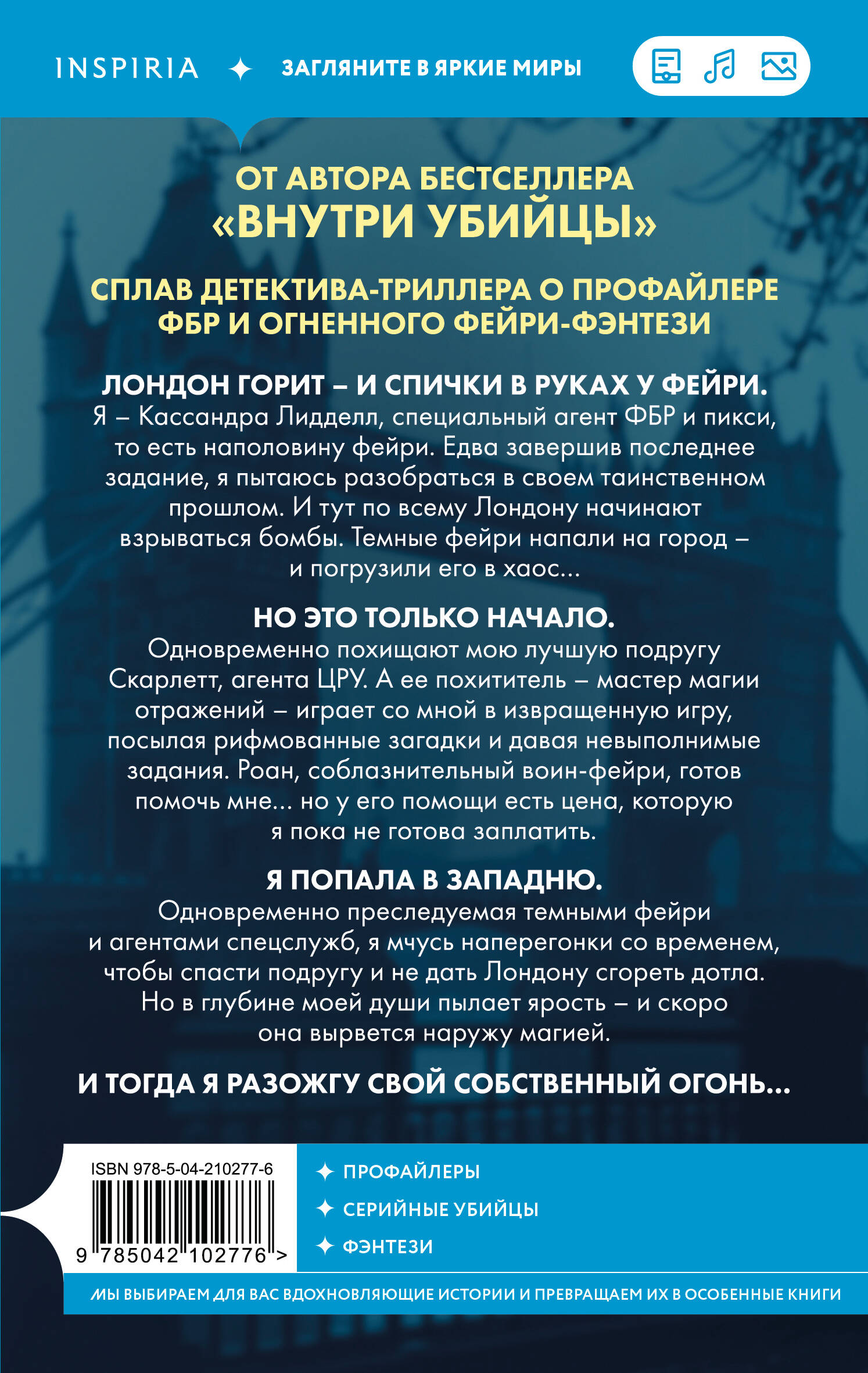 ОТ АВТОРА БЕСТСЕЛЛЕРА «ВНУТРИ УБИЙЦЫ». СПЛАВ ДЕТЕКТИВА-ТРИЛЛЕРА О ПРОФАЙЛЕРЕ ФБР И ОГНЕННОГО ФЕЙРИ-ФЭНТЕЗИ. Чтобы спастись от темных фейри, люди должны выставить против них светлых… ЛОНДОН ГОРИТ - И СПИЧКИ В РУКАХ У ФЕЙРИ. Я - Кассандра Лидделл, специальный агент ФБР и пикси, то есть наполовину фейри. Едва завершив последнее задание, я пытаюсь разобраться в своем таинственном прошлом. И тут по всему Лондону начинают взрываться бомбы. Темные фейри напали на город - и погрузили его в хаос… НО ЭТО ТОЛЬКО НАЧАЛО. Одновременно похищают мою лучшую подругу Скарлетт, агента ЦРУ. А ее похититель - мастер магии отражений - играет со мной в извращенную игру, посылая рифмованные загадки и давая невыполнимые задания. Роан, соблазнительный воин-фейри, готов помочь мне… но у его помощи есть цена, которую я пока не готова заплатить. Я ПОПАЛА В ЗАПАДНЮ. Одновременно преследуемая темными фейри и агентами спецслужб, я мчусь наперегонки со временем, чтобы спасти подругу и не дать Лондону сгореть дотла. Но в глубине моей души пылает ярость - и скоро она вырвется наружу магией. И ТОГДА Я РАЗОЖГУ СВОЙ СОБСТВЕННЫЙ ОГОНЬ…| Издательство | ООО "Издательство "Эксмо" |