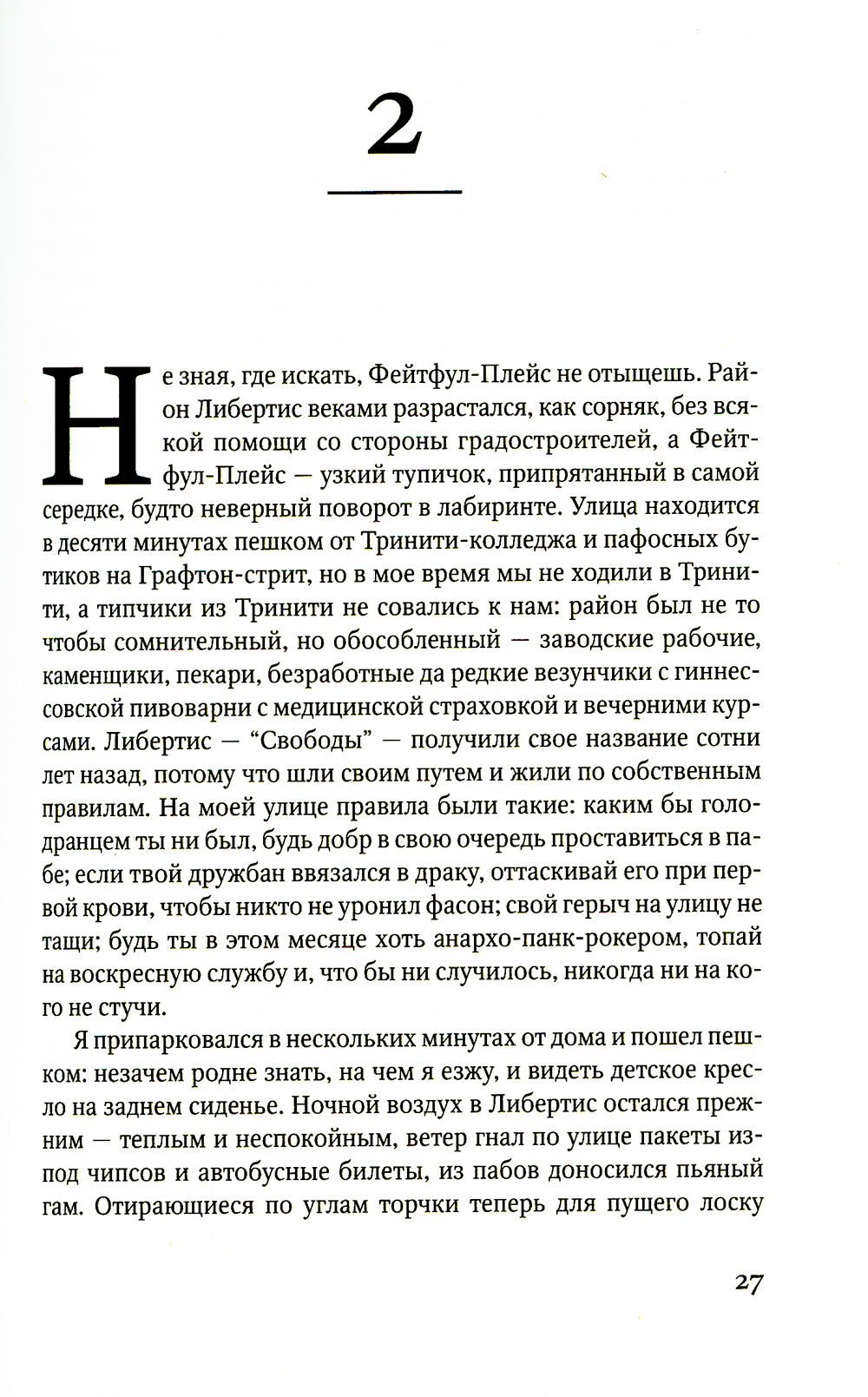 В 1985 году Фрэнку Мэкки было девятнадцать, он мечтал сбежать из тесной квартиры своей безумной семьи на Фейтфул-Плейс и вместе со своей девушкой Рози перебраться из Дублина в Лондон. Но Рози в ночь, на которую юные влюбленные запланировали побег в новую жизнь, не пришла на место встречи. Спустя двадцать два года Фрэнк - один из лучших детективов полиции Дублина. И однажды в заброшенном доме на Фейтфул-Плейс строители находят старенький чемодан, находка указывает на то, что исчезновение Рози, возможно, объясняется вовсе не ее бегством. Нравится это Фрэнку или нет, но он вынужден вернуться в район, где родился и вырос, к родным, от которых так старался держаться подальше.| Издательство | Фантом Пресс |