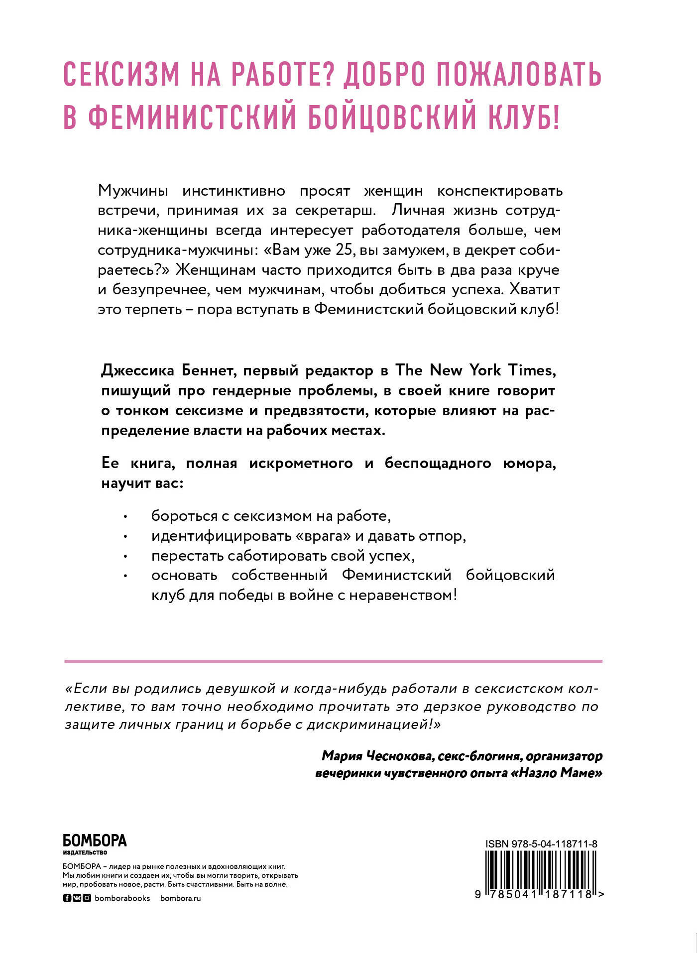 Сексизм на работе? Добро пожаловать в «Феминистский бойцовский клуб»! Мужчины инстинктивно просят женщин конспектировать встречи, принимая их за секретарш. Личная жизнь сотрудника-женщины всегда интересует работодателя больше, чем сотрудника-мужчины: «Вам уже 25, вы замужем, в декрет собираетесь?» Женщинам часто приходится быть в два раза круче и безупречнее, чем мужчинам, чтобы добиться успеха. Хватит это терпеть - пора вступать в Феминистский бойцовский клуб! Джессика Беннетт, первый редактор в The New York Times, пишущий про гендерные проблемы, в своей книге говорит о тонком сексизме и предвзятости, которые влияют на распределение власти на рабочих местах. Ее книга, полная искрометного и беспощадного юмора, научит вас: • бороться с сексизмом на работе, • идентифицировать«врага» и давать отпор, • перестать саботировать свой успех, • основать собственный Феминистский бойцовский клуб для победы в войне с неравенством!| Издательство | ООО "Издательство "Эксмо" |