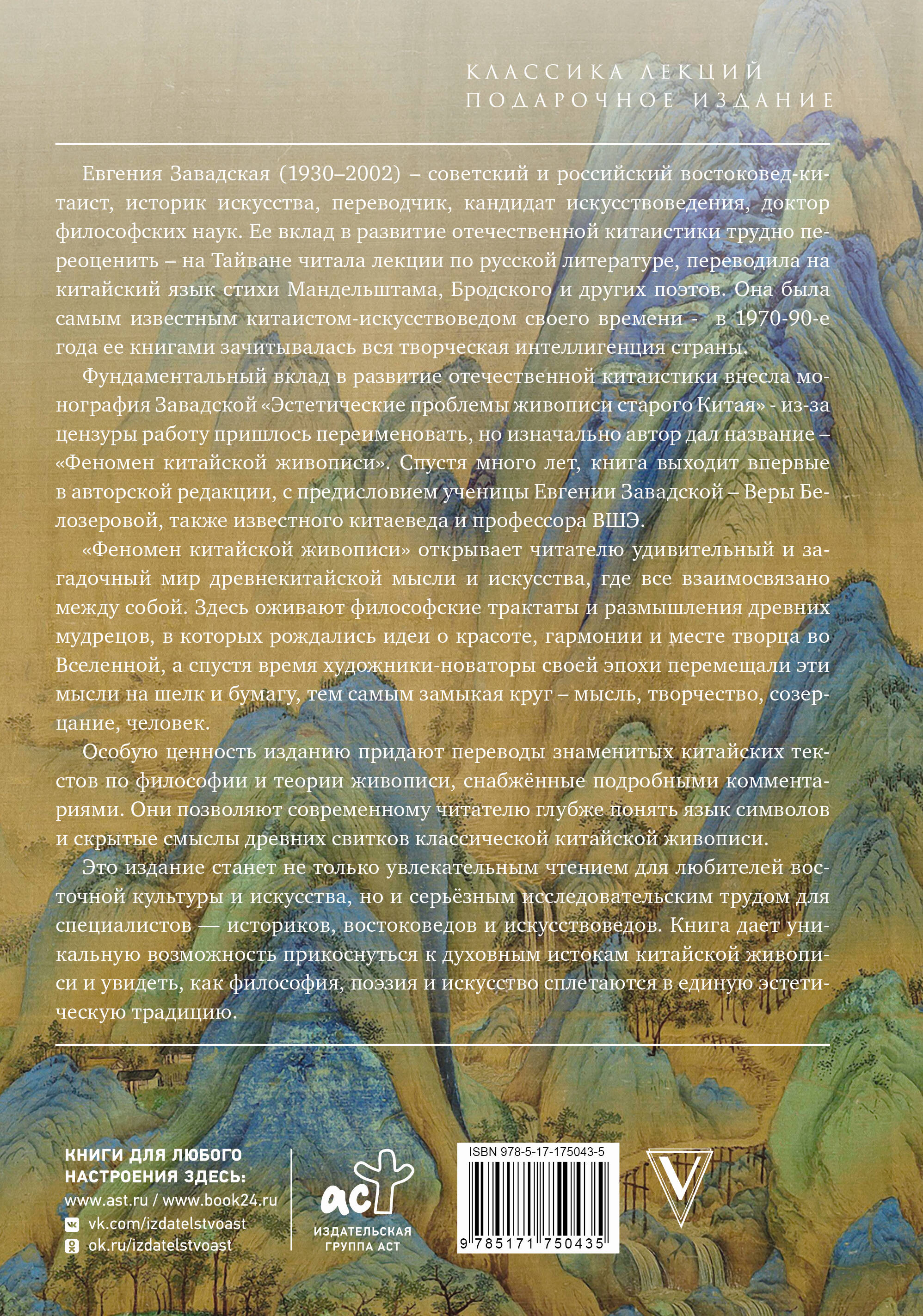 Евгения Завадская (1930-2002) - советский и российский востоковед-китаист, историк искусства, переводчик, кандидат искусствоведения, доктор философских наук. Её участие в развитие отечественной китаистики трудно переоценить - на Тайване читала лекции по русской литературе, переводила на китайский язык сти- хи Мандельштама, Бродского и других поэтов. Она была самым известным кита- истом-искусствоведом своего времени - в 1970-90-е годы её книгами зачитывалась вся творческая интеллигенция страны. Фундаментальный вклад в развитие отечественной китаистики внесла монография Завадской "Эстетические проблемы живописи старого Китая" - из-за цензуры работу пришлось переименовать, но изначально автор дал название - "Феномен ки- тайской живописи". Спустя много лет, её труды выходят впервые в авторской редакции, с предисловием ученицы Евгении Завадской - Веры Белозёровой, также известного китаеведа и профессора ВШЭ. "Феномен китайской живописи" открывает читателю удивительный и загадоч- ный мир древнекитайской мысли и искусства. Здесь оживают философские трактаты и размышления древних мудрецов, в которых рождались идеи о красоте, гармонии и месте человека во Вселенной, а спустя время художники-новаторы своей эпохи воплощали эти мысли на шёлк и бумагу, тем самым замыкая круг - мысль, творчество, созерцание, человек. Особую ценность изданию придают переводы знаменитых китайских текстов по философии и теории живописи, снабжённые подробными комментариями. Они позволяют современному читателю глубже понять язык символов и скрытые смыслы древних свитков традиционной китайской живописи. Это издание станет не только увлекательным чтением для любителей восточ- ной культуры и искусства, но и серьёзным исследовательским трудом для специ- алистов - историков, востоковедов, искусствоведов и культурологов. Книга дает уникальную возможность прикоснуться к духовным истокам китайской живописи и увидеть, как философия, поэзия и искусство сплетаются в единую эстетическую традицию.| Издательство | Издательство "АСТ" |