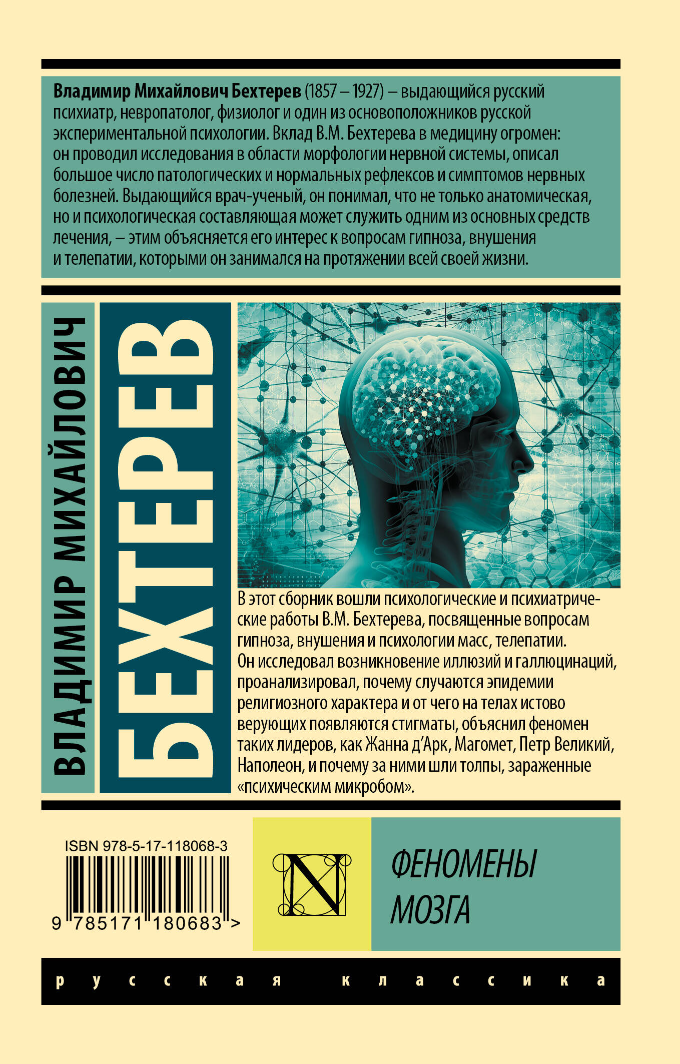 В этот сборник вошли психологические и психиатрические работы В.М. Бехтерева, посвященные вопросам гипноза, внушения и психологии масс, телепатии. Он исследовал возникновение иллюзий и галлюцинаций, проанализировал, почему случаются эпидемии религиозного характера и от чего на телах истово верующих появляются стигматы, объяснил феномен таких лидеров, как Жанна д'Арк, Магомет, Петр Великий, Наполеон, и почему за ними шли толпы, зараженные "психическим микробом".| Издательство | ИЗДАТЕЛЬСТВО "АСТ" |