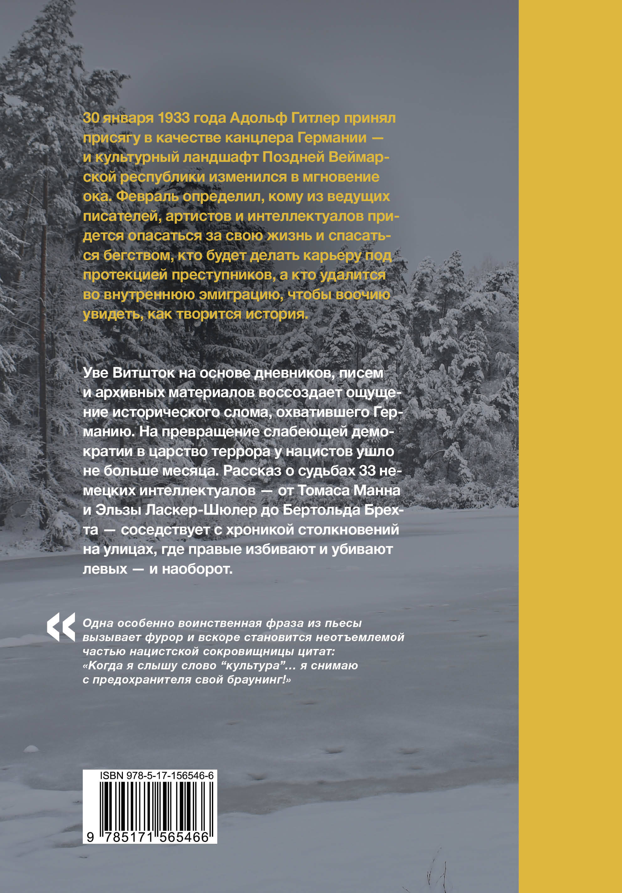 30 января 1933 года Адольф Гитлер принял присягу в качестве канцлера Германии - и культурный ландшафт Поздней Веймарской республики изменился в мгновение ока. Февраль определил, кому из ведущих писателей, артистов и интеллектуалов придется опасаться за свою жизнь и спасаться бегством, кто будет делать карьеру под протекцией преступников, а кто удалится во внутреннюю эмиграцию, чтобы воочию увидеть, как творится история. Уве Витшток на основе дневников, писем и архивных материалов воссоздает ощущение исторического слома, охватившего Германию. На превращение слабеющей демократии в царство террора у нацистов ушло не больше месяца. Рассказ о судьбах 33 немецких интеллектуалов - от Томаса Манна и Эльзы Ласкер-Шюлер до Бертольда Брехта - соседствует с хроникой столкновений на улицах, где правые избивают и убивают левых - и наоборот.| Издательство | Издательство "АСТ" |