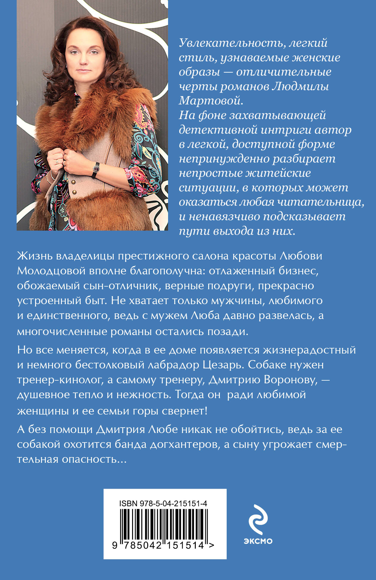 Жизнь владелицы престижного салона красоты Любови Молодцовой вполне благополучна: отлаженный бизнес, обожаемый сын-отличник, верные подруги, прекрасно устроенный быт. Не хватает только мужчины, любимого и единственного, ведь с мужем Люба давно развелась, а многочисленные романы остались позади. Но все меняется, когда в ее доме появляется жизнерадостный и немного бестолковый лабрадор Цезарь. Собаке нужен тренер-кинолог, а самому тренеру, Дмитрию Воронову, - душевное тепло и нежность. Тогда он ради любимой женщины и ее семьи горы свернет! А без помощи Дмитрия Любе никак не обойтись, ведь за ее собакой охотится банда догхантеров, а сыну угрожает смертельная опасность… Людмила Мартова - мастер увлекательной детективной мелодрамы, автор захватывающих остросюжетных историй. Их отличают закрученная детективная интрига, лихой финал с неожиданной развязкой и, конечно же, яркая любовная линия. Героини романов Людмилы Мартовой - современные молодые женщины, которые точно знают, чего хотят от жизни.| Издательство | ООО "Издательство "Эксмо" |