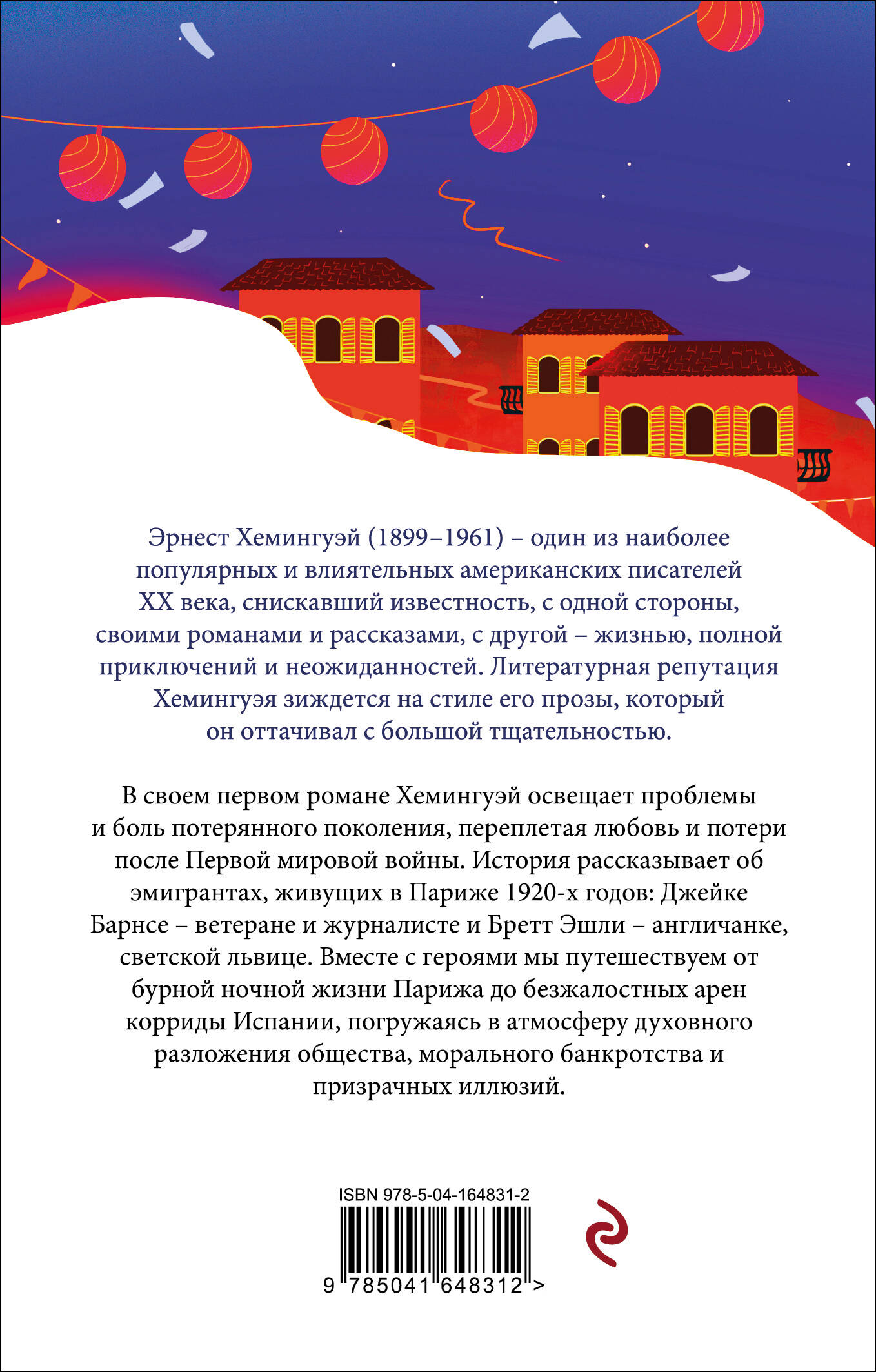 Эрнест Хемингуэй (1899-1961) - один из наиболее популярных и влиятельных американских писателей ХХ века, снискавший известность, с одной стороны, своими романами и рассказами, с другой - жизнью, полной приключений и неожиданностей. Литературная репутация Хемингуэя зиждется на стиле его прозы, который он оттачивал с большой тщательностью. В своем первом романе Хемингуэй освещает проблемы и боль потерянного поколения, переплетая любовь и потери после Первой мировой войны. История рассказывает об эмигрантах, живущих в Париже 1920-х гг.: Джейке Барнсе - ветеране и журналисте и Бретт Эшли - англичанке, светской львице. Вместе с героями мы путешествуем от бурной ночной жизни Парижа до безжалостных арен корриды Испании, погружаясь в атмосферу духовного разложения общества, морального банкротства и призрачных иллюзий.| Издательство | Эксмо |