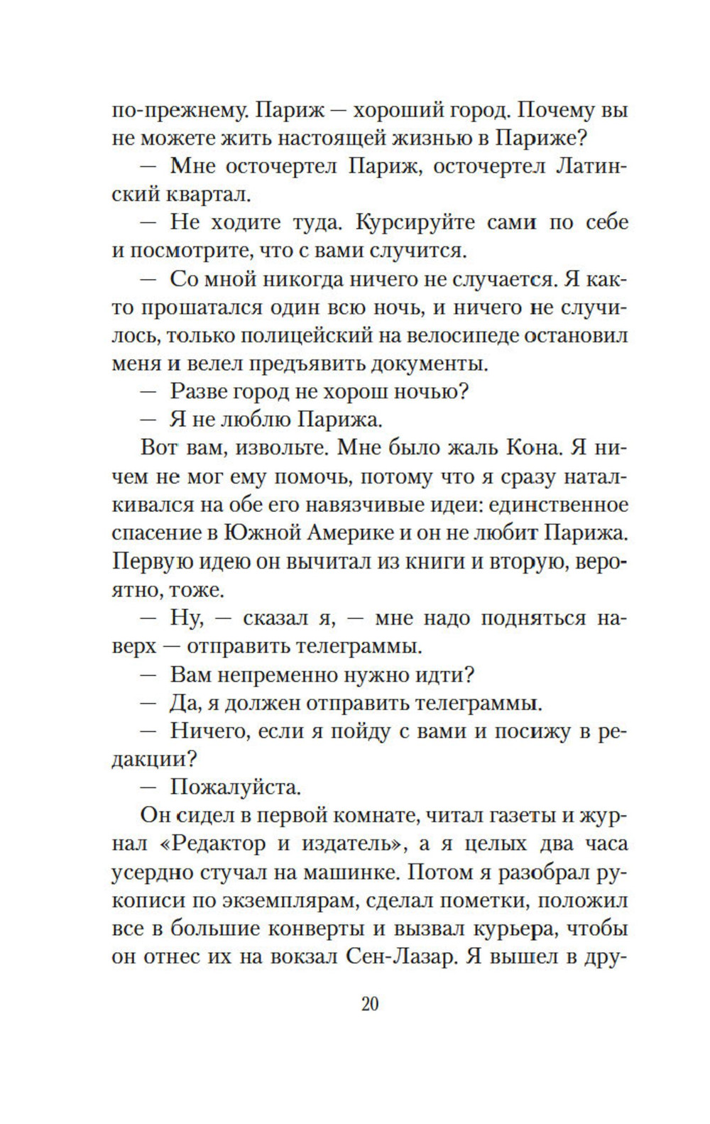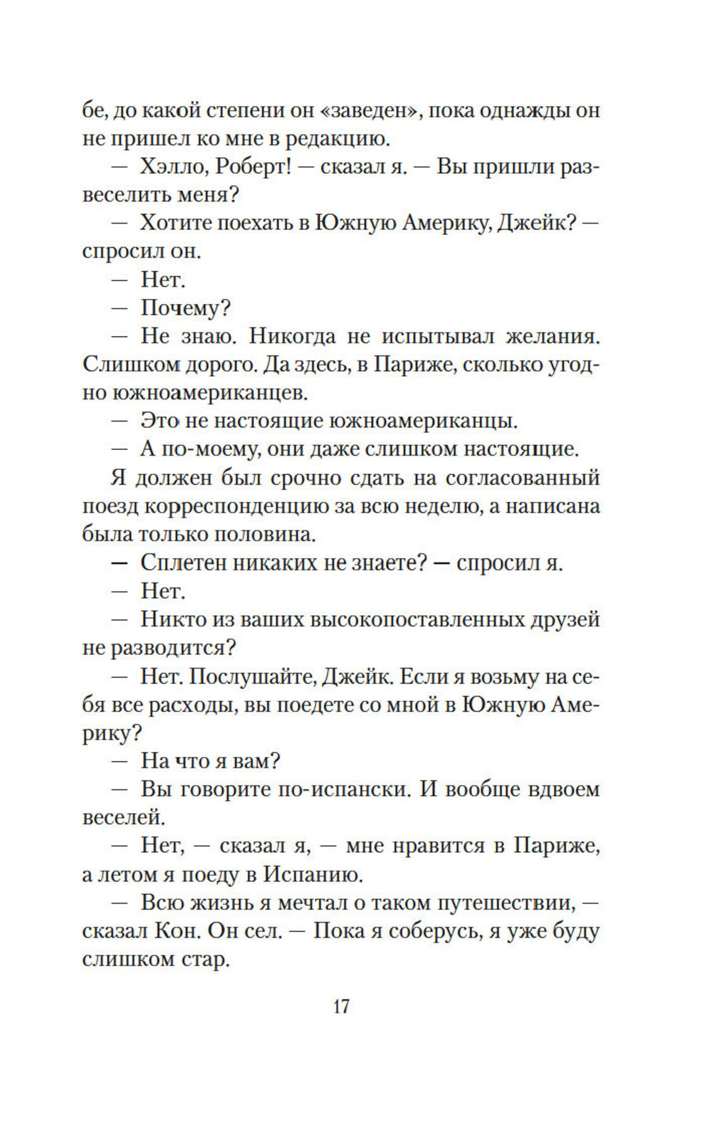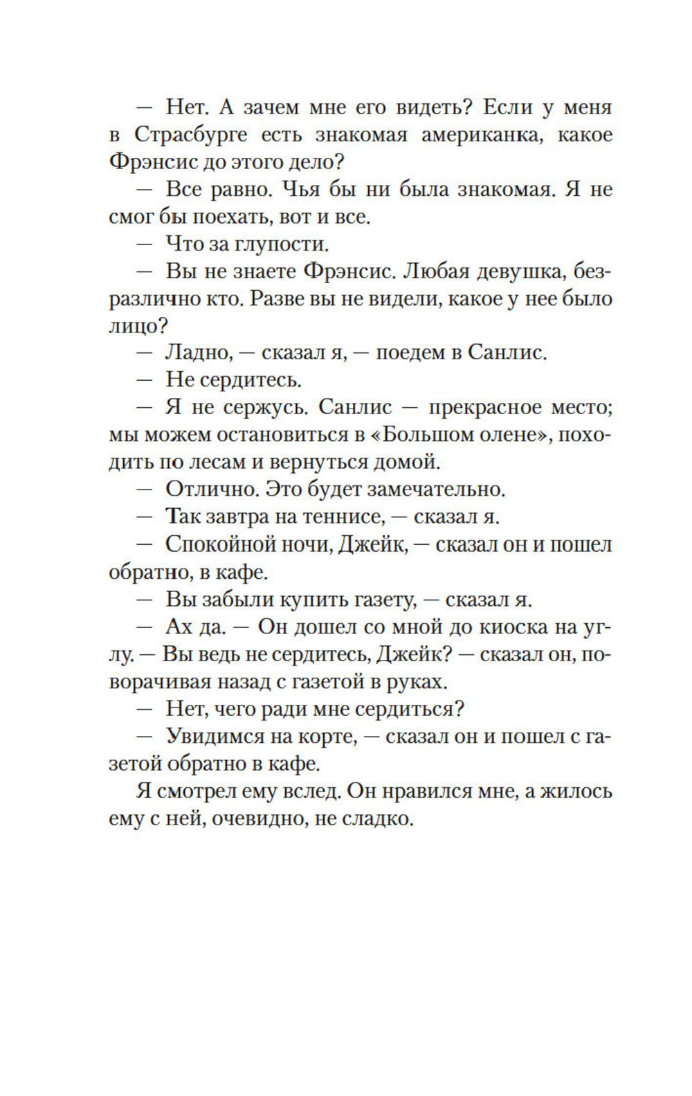 Эрнест Хемингуэй (1899-1961) - знаменитый американский писатель, лауреат Пулицеровской и Нобелевской премий, автор таких книг, как "Фиеста", "Прощай, оружие!", "Старик и море" и многих, многих других. Особое обаяние Хемингуэя заключено в той цельности, где воедино сплавлены литературный стиль и жизненный облик, характер самого писателя. О чем бы он ни писал - о войне и любви, о море и рыбной ловле, о корриде и боксерах, о зеленых холмах Африки или о Париже, - печать его личности ложится на страницы с такой мужественной силой и четкостью, что спутать прозу Хемингуэя с чьей-либо еще невозможно. Первый роман Эрнеста Хемингуэя "Фиеста" ("И восходит солнце"), принесший автору широкую известность (в 1983 году газета "Нью-Йорк таймс" сообщила, что роман был непрерывно в печати с момента публикации и является одним из самых переводимых американских романов), основан на реальных событиях. Герои романа (принадлежащие к так называемому "потерянному поколению"), вернувшиеся с Первой мировой войны, стремятся уйти от тягостных воспоминаний и забыться в легкой парижской жизни. Они испытывают постоянную жажду новых переживаний и голод по сердечному человеческому общению. А почувствовать себя обновленными, полнокровно живыми они могут лишь в те редкие минуты, которые дарует им самозабвенная любовь и дружба.| Издательство | Азбука-Аттикус Издат.группа ООО |
