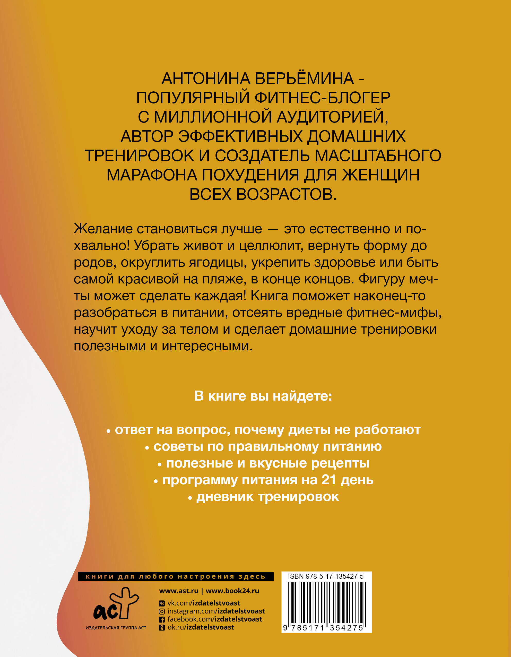 Антонина Верьёмина - популярный фитнес-блогер с миллионной аудиторией, автор эффективных домашних тренировок и создатель масштабного марафона похудения для женщин всех возрастов. Желание становиться лучше - это естественно и похвально! Убрать живот и целюлит, вернуть форму до родов, округлить ягодицы, укрепить здоровье или быть самой красивой на пляже, в конце концов. Фигуру мечты может сделать каждая! Книга поможет наконец-то разобраться в питании, отсеять вредные фитнес-мифы, научит уходу за телом и сделает домашние тренировки полезными и интересными. В книге вы найдете: - все о том, почему диеты не работают - советы по правильному питанию - полезные и вкусные рецепты - программу питания на 21 день - дневник тренировок| Издательство | Издательство "АСТ" |
