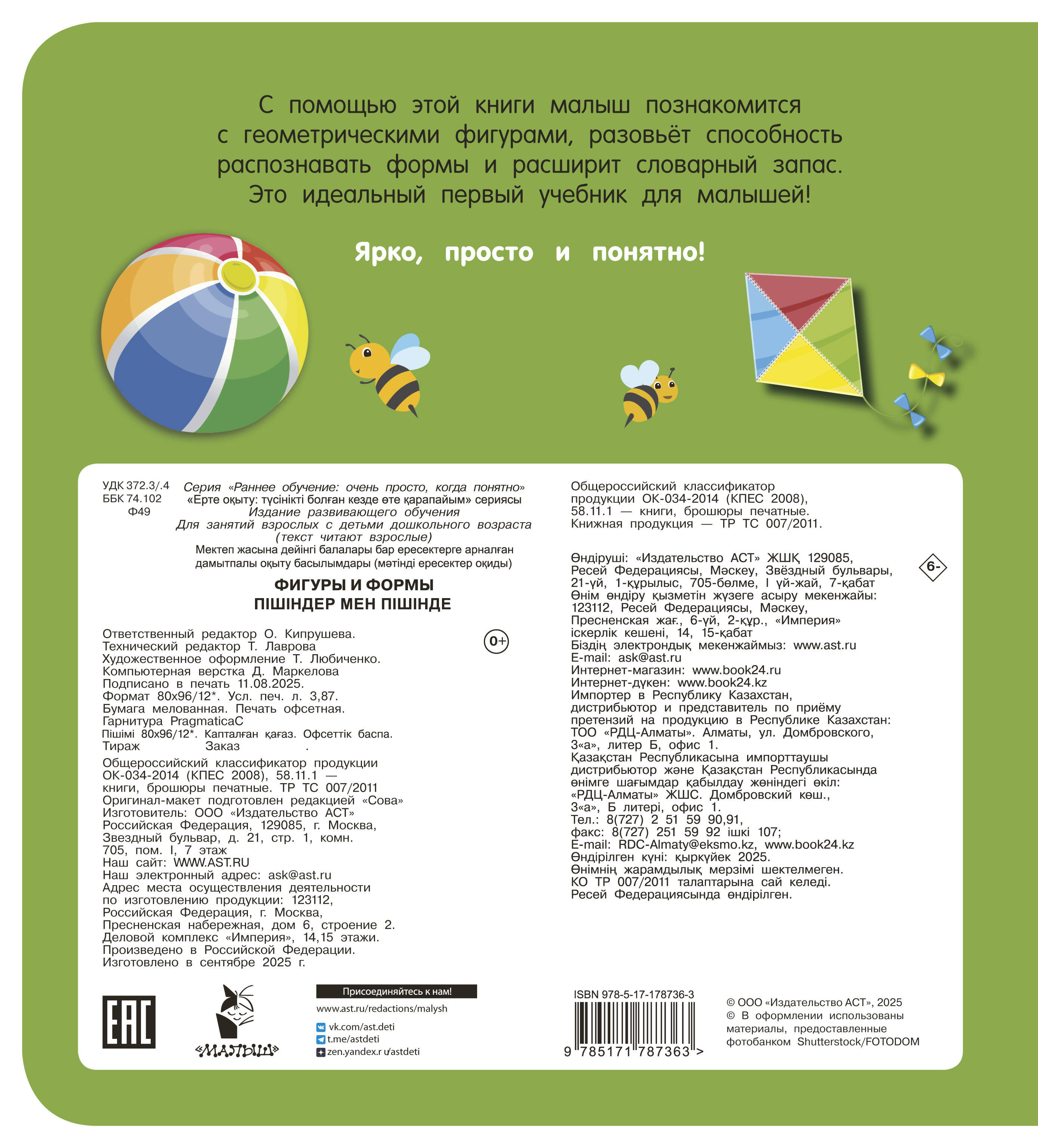 «Фигуры и формы» - отличный старт в изучении первых геометрических понятий! Лаконичный, но визуально насыщенный дизайн поможет детям освоить базовые фигуры. Красочные иллюстрации, простые образы и чёткая визуальная связь между формой и предметом способствуют развитию внимания, мышления и речи. Маленькие читатели с удовольствием будут возвращаться к книге снова и снова. А родители смогут использовать её как наглядное пособие для развивающих занятий. Качественная мелованная бумага и закруглённые углы страниц делают книгу прочной и безопасной - она не порвётся и не помнётся, а ребёнок не порежется! Идеальный подарок малышу для первых шагов в обучении - просто, наглядно и красочно!| Издательство | Издательство "АСТ" |