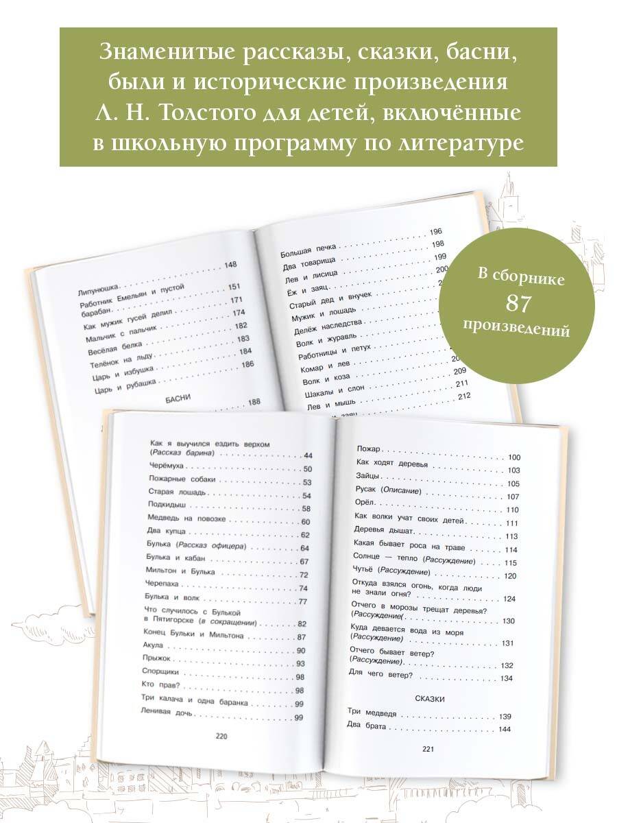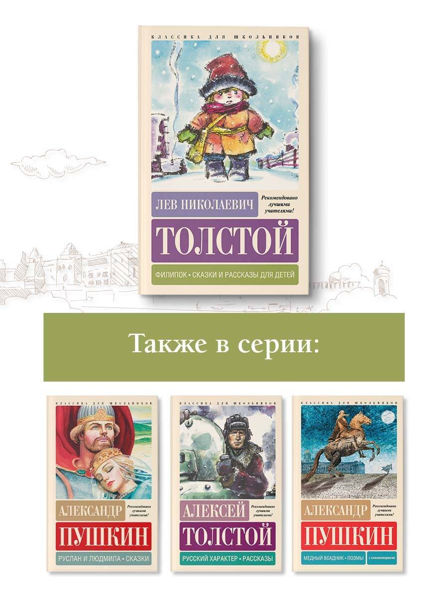 Произведения Л.Н. Толстого - классика мировой литературы- проходят во всех классах начальной школы. В сборник вошли все произведения, которые проходят дети на уроках литературного чтения; по ним пишут диктанты, изложения и сочинения. Лев Николаевич Толстой (1828-1910) - великий русский писатель, один из величайших писателей-романистов мира, мыслитель, просветитель, публицист, участник обороны Севастополя. В своём имении Ясная Поляна и в окрестностях деревни Толстой основал школы для крестьянских детей. Через год после их открытия писатель отправился за границу, чтобы узнать, как устроено народное образование в европейских школах. Толстой хотел создать свою систему образования в яснополянской школе: он упразднил все правила дисциплины и отменил педагогические программы. В 1862 г. писатель начал издавать педагогический журнал "Ясная Поляна" с книгами для чтения. В 1872 г. была издана "Азбука" Л. Толстого - школьное пособие для обучения детей чтению, письму и арифметике. Азбука состояла из четырёх книг, включающих короткие истории, былины, басни, загадки для детей, а также - рекомендации педагогам, методические советы и общие замечания. По азбуке дети легко могли научиться писать, считать и читать. Толстой часто писал о крестьянских детях в своих сказках и рассказах. Поучительные и добрые истории позволяют окунуться в мир простой русской деревни, где герои благодаря упорству, силе духа и дружелюбию достигают цели и осуществляют свои мечты. В сборник вошли рассказы, сказки и былины из Азбуки Л.Н. Толстого. Филипок (1875) - рассказ о маленьком крестьянском мальчике, который очень хотел учиться, но из-за возраста его не пускали в школу.| Издательство | Издательство "АСТ" |