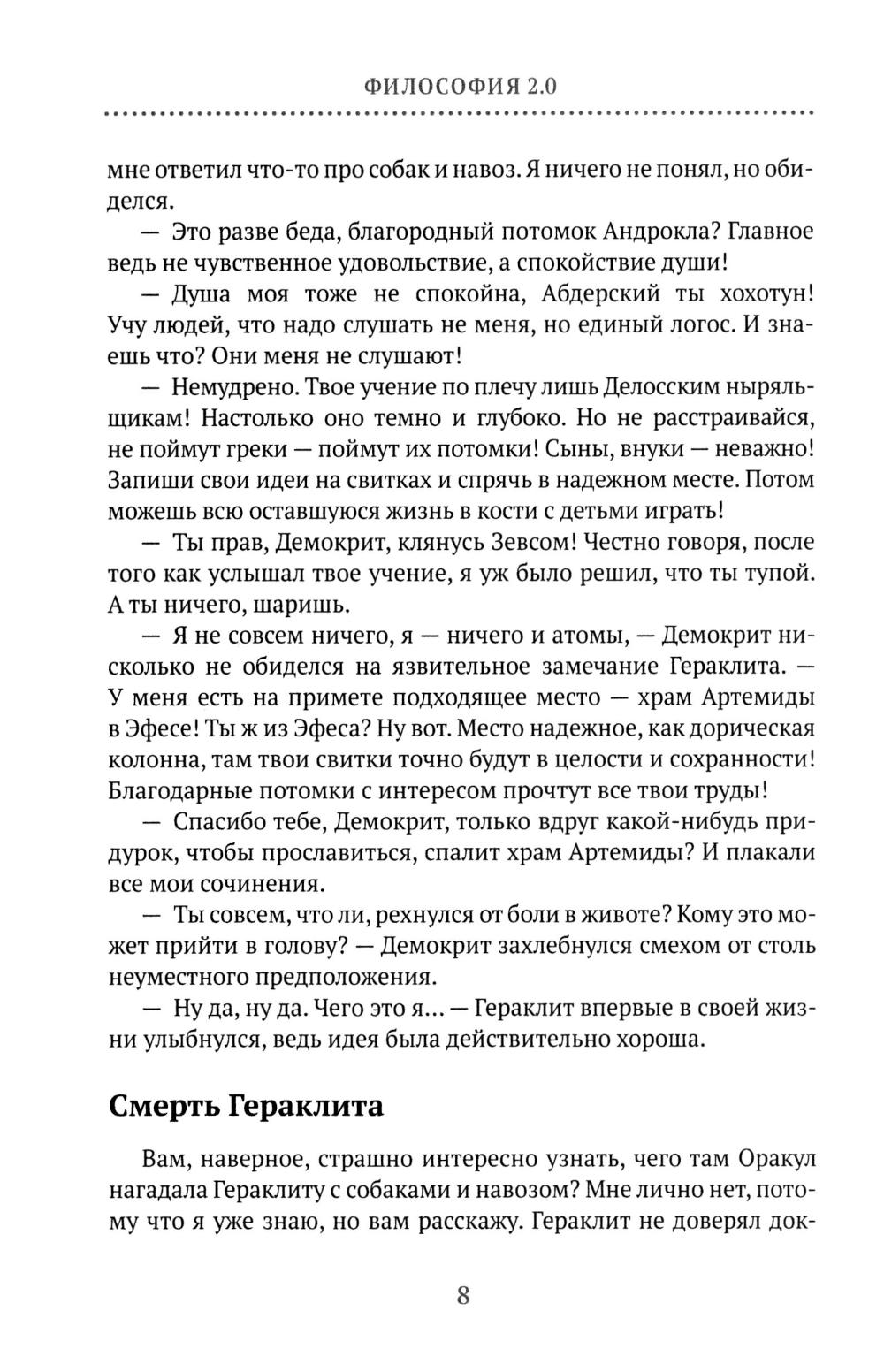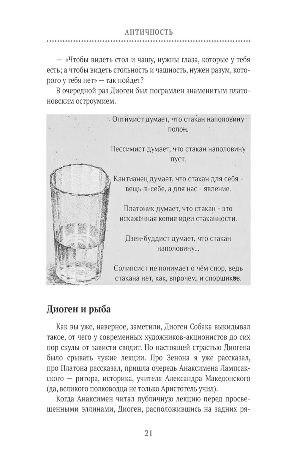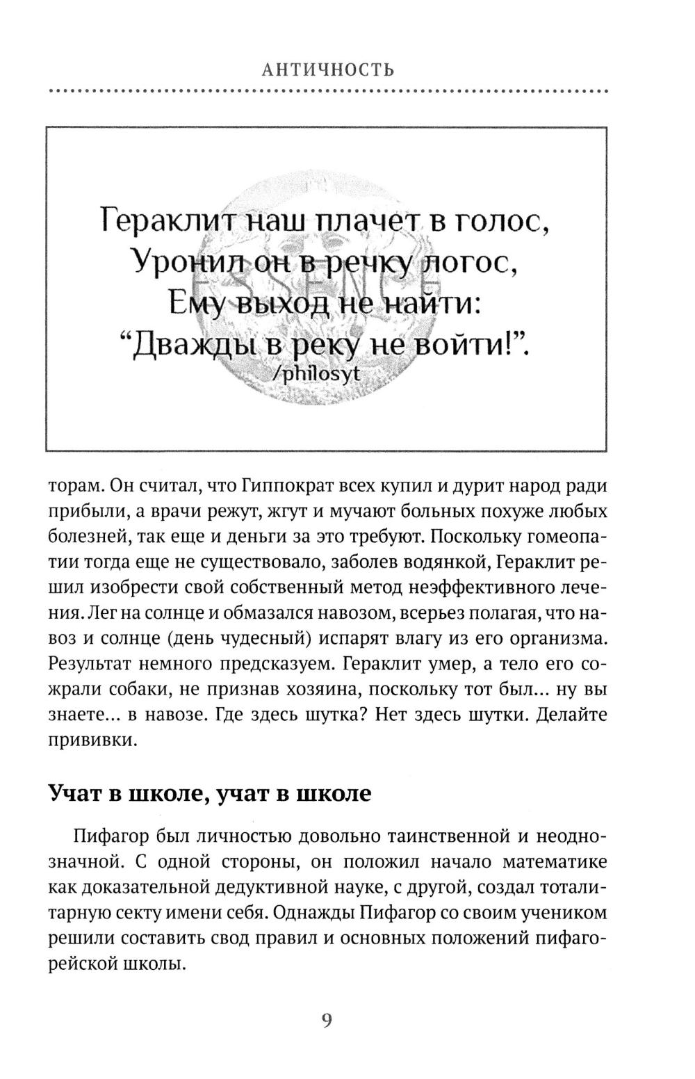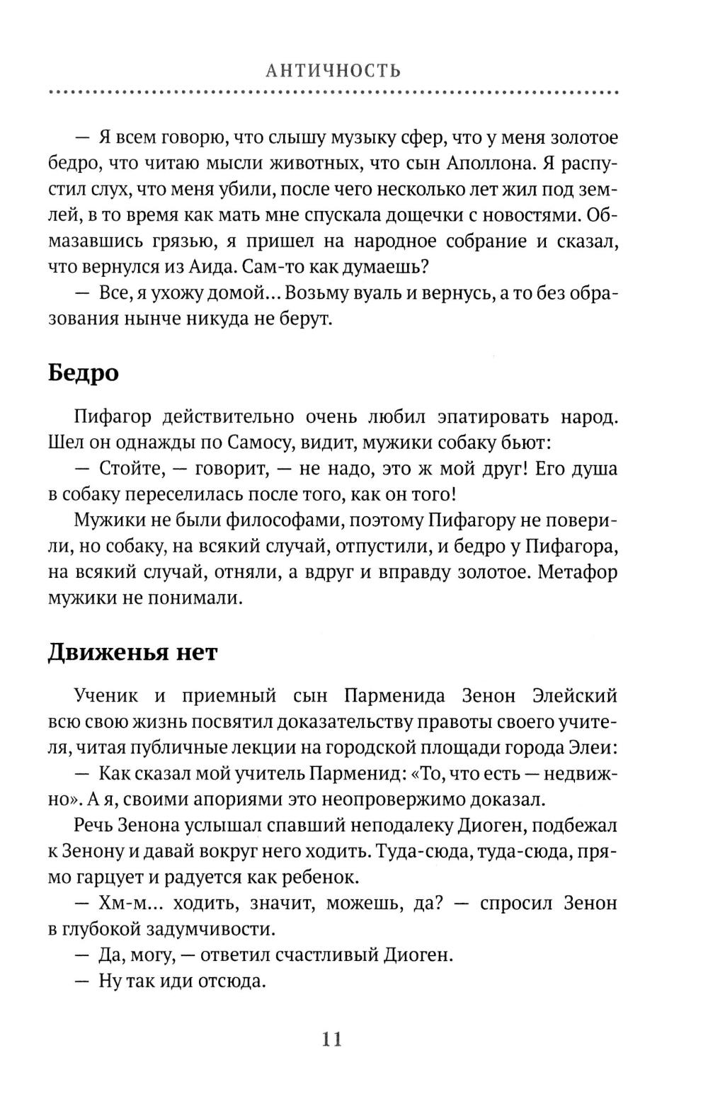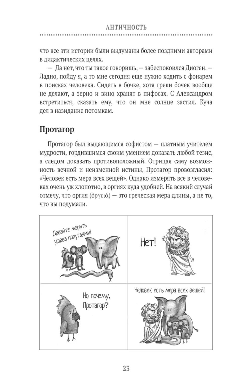 Большое начинается с малого. Из авторского проекта «Суть философии», бороздящего просторы «ВКонтакте», получилась книга, вобравшая в себя все лучшее, что случилось с «Сутью...» за девять лет ее существования и даже больше: рассказы, иллюстрации, стихи и сказки. В этой книге, как в Греции, все есть и все дышит философией. В ней вы узнаете тайну бороды Маркса и происхождения Лейбница; почему Диоген ненавидел кур, а Фрэнсис Бэкон - обожал их; почему Рене Декарт бил животных, а Фридрих Ницше - заключал в объятия; как трубка спасла жизнь Бертрану Расселу, а кочерга сломала жизнь Карлу Попперу. Словом, узнаете о жизни философов и людей. Не пытайтесь понять, какие истории из этой книги выдуманы, а какие действительно произошли. Художественный вымысел столь причудливым образом переплетается с историческими фактами, что я уже и сам не отличу. Договоримся так: все это было. А если нет - то могло. А если не могло - то все-таки случилось на страницах моей книги. И этого достаточно.