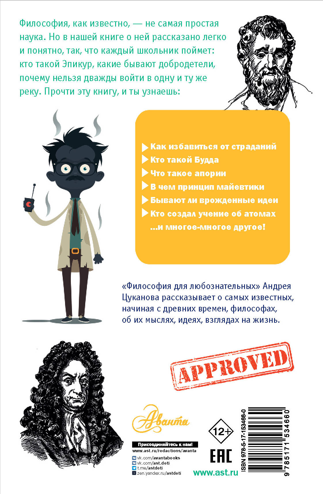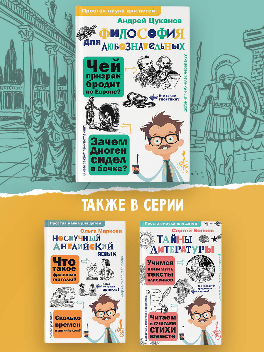 Философия, как известно, - не самая простая наука. Чтобы в ней как следует разобраться, нужно прочесть немало книг и трудов античных, средневековых, современных философов. Книга Андрея Львовича Цуканова "Философия для любознательных" будет полезна как школьникам 12-16 лет, так и студентам филологических вузов. В ней понятно рассказывается об основных направлениях философии, основных понятиях, учениях таких мыслителей, как Лао-цзы, Демокрит, Сократ, Платон, Аврелий Августин, Френсис Бэкон, Владимир Соловьев. Вы узнаете, какие бывают добродетели, почему нельзя дважды войти в одну и ту же реку, почему человек есть "мыслящий тростник" и многое-многое другое. Для среднего школьного возраста.| Издательство | ИЗДАТЕЛЬСТВО "АСТ" |