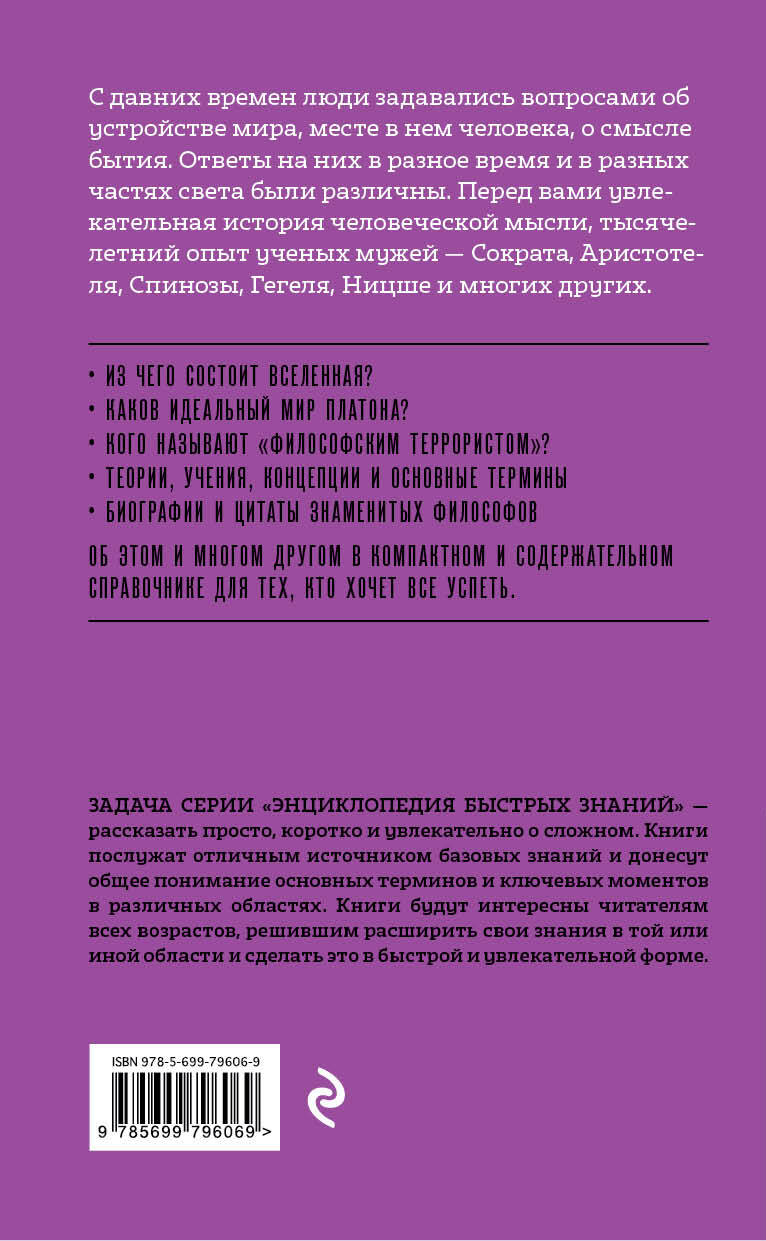 О книге: Почему человеку хочется понять, как устроен мир, где его место в нем и в чем смысл его существования? За несколько тысячелетий философия накопила огромное количество ответов на эти вопросы. Даже определение философии само по себе является открытым вопросом! Попробуем же приоткрыть завесу тайны и порассуждать о смысле бытия вместе с Платоном, Аристотелем, Кантом, Ницше и многими другими известными философами. О серии: Задача серии «Энциклопедия быстрых знаний» - рассказать просто, коротко и увлекательно о сложном. Книги послужат отличным источником базовых знаний и донесут общее понимание основных терминов и ключевых моментов в различных областях. Они будут интересны читателям всех возрастов, решившим расширить свои знания в той или иной области и сделать это в быстрой и увлекательной форме.| Издательство | ООО "Издательство "Эксмо" |