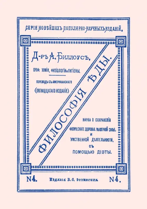 Репринтное издание. С. -Петербург. Издание В. С. Эттингера, Казанская, 44, 1895. Перевод с пятнадцатого американского издания д-ра М. А. Раскиной. (Phylosophy of eating, a science of preserving health, muscle strength and mental labour by means of diet). Д-р А. Биллоус - профессор химии, физиологии и гигиены. Книга изготовлена по технологии "печать по требованию". Тираж 30 экз.