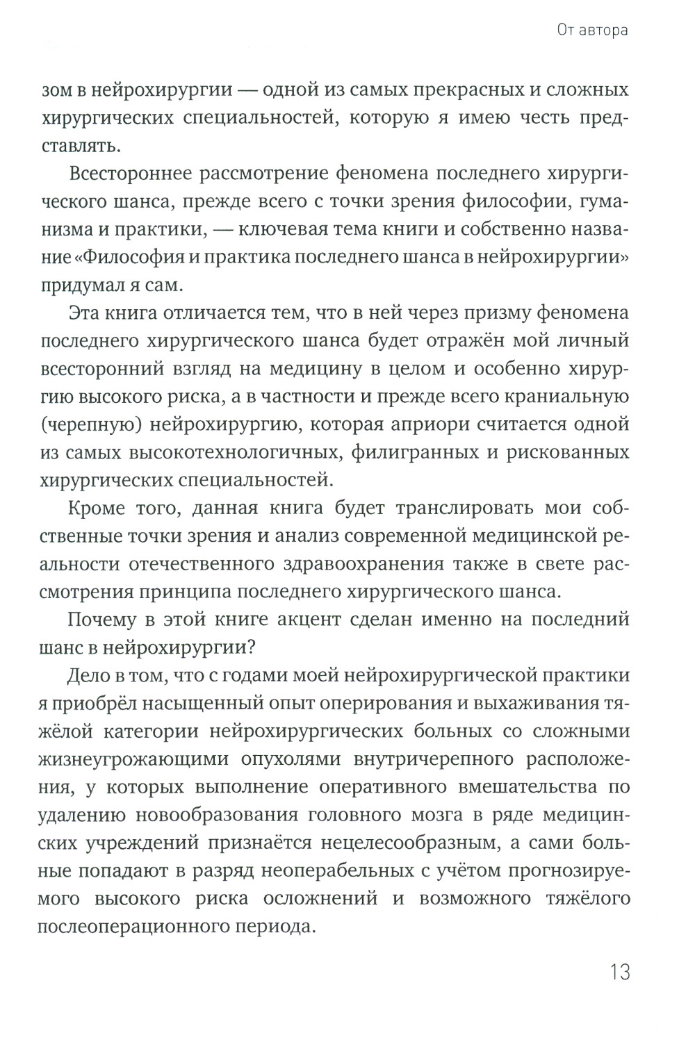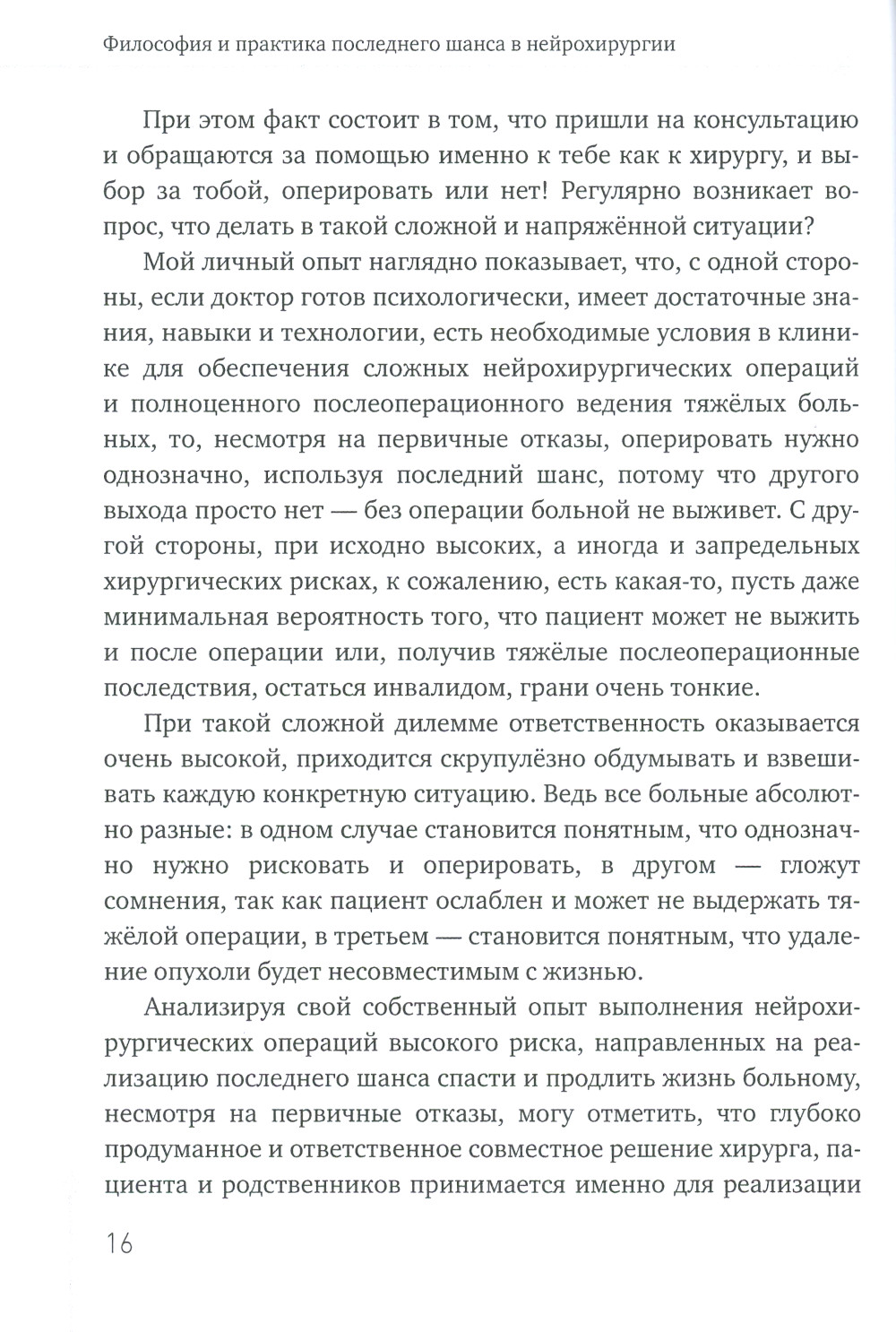 Авторская книга доктора К.Г. Айрапетова отражает философский и практический взгляд на актуальный вопрос о так называемом последнем шансе в хирургии и нейрохирургии, в частности. Всестороннее рассмотрение феномена последнего хирургического шанса с точки зрения философии, гуманизма и практики - ключевая тема книги. Книга отличается тем, что в ней через призму идеологии последнего шанса отражён личный всесторонний взгляд автора на медицину в целом и особенно хирургию высокого риска, в частности и прежде всего, краниальную (черепную) нейрохирургию, которая априори считается одной из самых филигранных и рискованных хирургических специальностей. На страницах книги обсуждается ряд важнейших вопросов, которые так или иначе будут волновать многих людей. Речь пойдет о самой нейрохирургии и её некоторых важных аспектах, искусстве врачевания, ценностях, качестве и смысле жизни, о мотивациях тяжело больного человека и практикующего хирурга, врачебном нигилизме, хирургическом риске, ответственности врача, развитии хирургии, коммерциализации медицины и многом другом, что заставляет задуматься о будущем медицины и перспективах морального здоровья общества. Данная книга скорее всего наиболее заинтересует практикующих докторов разных специализаций, она также может быть полезной для врачей-ординаторов и молодых нейрохирургов, которые только начинают свой нелёгкий путь в практическом здравоохранении. Автор старался написать книгу доступным языком, чтобы она смогла бы заинтересовать не только медработников, но и широкую аудиторию читателей, которые интересуются медициной, философией, проблемами отечественного здравоохранения и гуманизма.| Издательство | Де'Либри |
