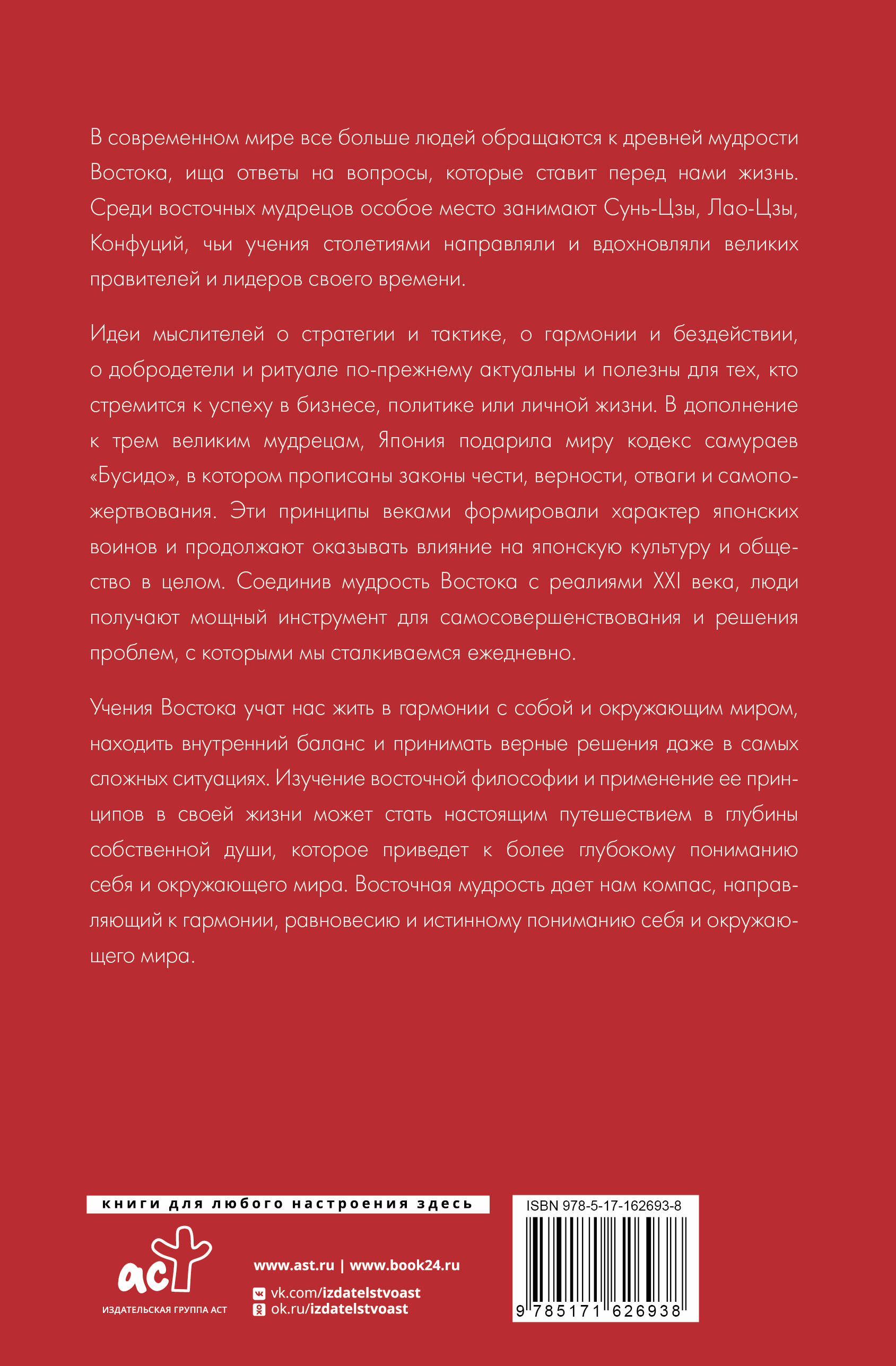 В современном мире все больше людей обращаются к древней мудрости Востока, ища ответы на вопросы, которые ставит перед нами жизнь. Среди восточных мудрецов особое место занимают Сунь-Цзы, Лао-Цзы, Конфуций, чьи учения столетиями направляли и вдохновляли великих правителей и лидеров своего времени. Идеи мыслителей о стратегии и тактике, о гармонии и бездействии, о добродетели и ритуале по-прежнему актуальны и полезны для тех, кто стремится к успеху в бизнесе, политике или личной жизни. В дополнение к трем великим мудрецам. Япония подарила миру кодекс самураев "Бусидо", в котором прописаны законы чести, верности, отваги и самопожертвования. Эти принципы веками формировали характер японских воинов и продолжают оказывать влияние на японскую культуру и общество в целом. Соединив мудрость Востока с реалиями XXI века, люди получают мощный инструмент для самосовершенствования и решения проблем, с которыми мы сталкиваемся ежедневно. Учения Востока учат нас жить в гармонии с собой и окружающим миром, находить внутренний баланс и принимать верные решения даже в самых сложных ситуациях. Изучение восточной философии и применение ее принципов в своей жизни может стать настоящим путешествием в глубины собственной души, которое приведет к более глубокому пониманию себя и окружающего мира. Восточная мудрость дает нам компас, направляющий к гармонии, равновесию и истинному пониманию себя и окружающего мира.| Издательство | Издательство "АСТ" |