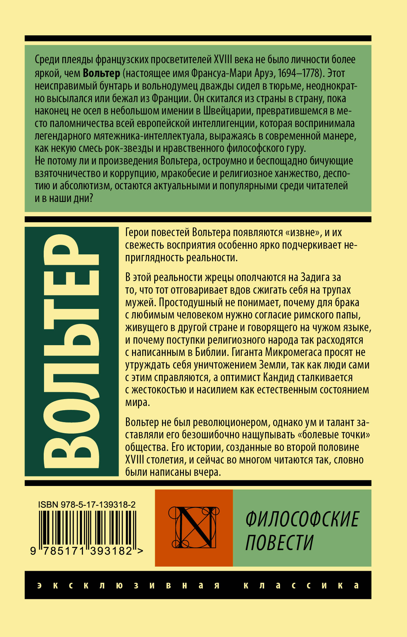 Герои повестей Вольтера появляются "извне", и их свежесть восприятия особенно ярко подчеркивает неприглядность реальности. В этой реальности жрецы ополчаются на Задига за то, что тот отговаривает вдов сжигать себя на трупах мужей. Простодушный не понимает, почему для брака с любимым человеком нужно согласие римского папы, живущего в другой стране и говорящего на чужом языке, и почему поступки религиозного народа так расходятся с написанным в Библии. Гиганта Микромегаса просят не утруждать себя уничтожением Земли, так как люди сами с этим справляются, а оптимист Кандид сталкивается с жестокостью и насилием как естественным состоянием мира. Вольтер не был революционером, однако ум и талант заставляли его безошибочно нащупывать "болевые точки" общества. Его истории, созданные во второй половине XVIII столетия, и сейчас во многом читаются так, словно были написаны вчера.| Издательство | Издательство "АСТ" |