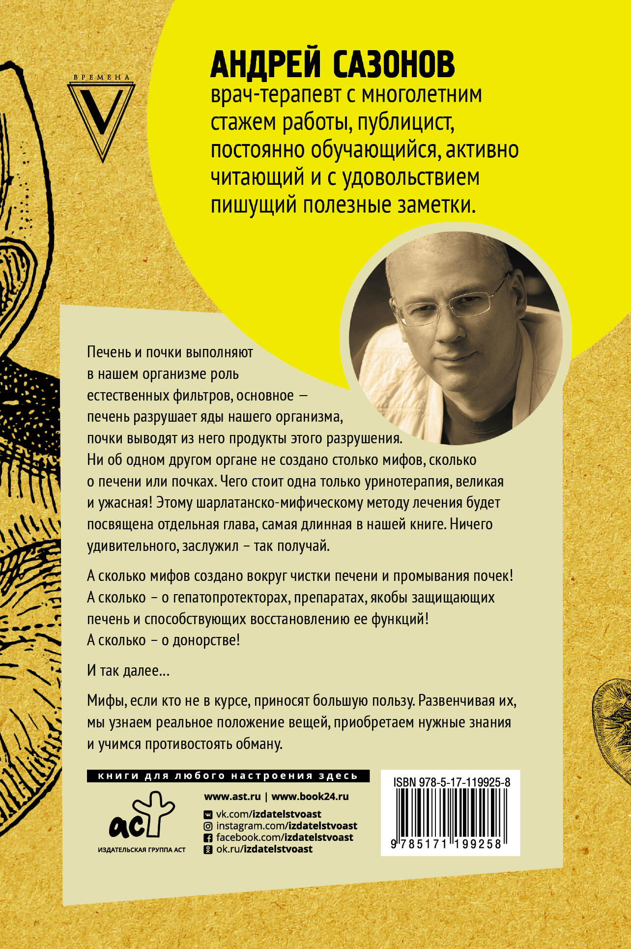 Андрей Сазонов - врач-терапевт с многолетним стажем работы, публицист, постоянно обучающийся, активно читающий и с удовольствием пишущий полезные заметки. Как не попасться в ловушку мифов и предубеждений, связанных с нашими почками и печенью, - учимся противостоять обману в новой книге Андрея Сазонова!| Издательство | ИЗДАТЕЛЬСТВО "АСТ" |