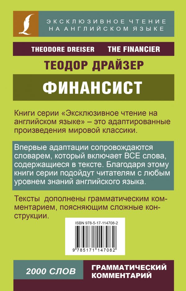 Первая книга "Трилогии желания" Теодора Драйзера, "Финансист" рассказывает историю Фрэнка Каупервуда - простого парня из провинциального города, обладающего великолепной интуицией. Фрэнк становится коммерсантом, играет на бирже и попадает в мир роскоши и больших денег, который со временем превращает его из амбициозного юноши в беспринципного, жаждущего наживы миллионера. Текст произведения снабжен грамматическим комментарием и словарем, в который вошли все слова, содержащиеся в тексте. Благодаря этому книга подойдет для любого уровня владения языком.