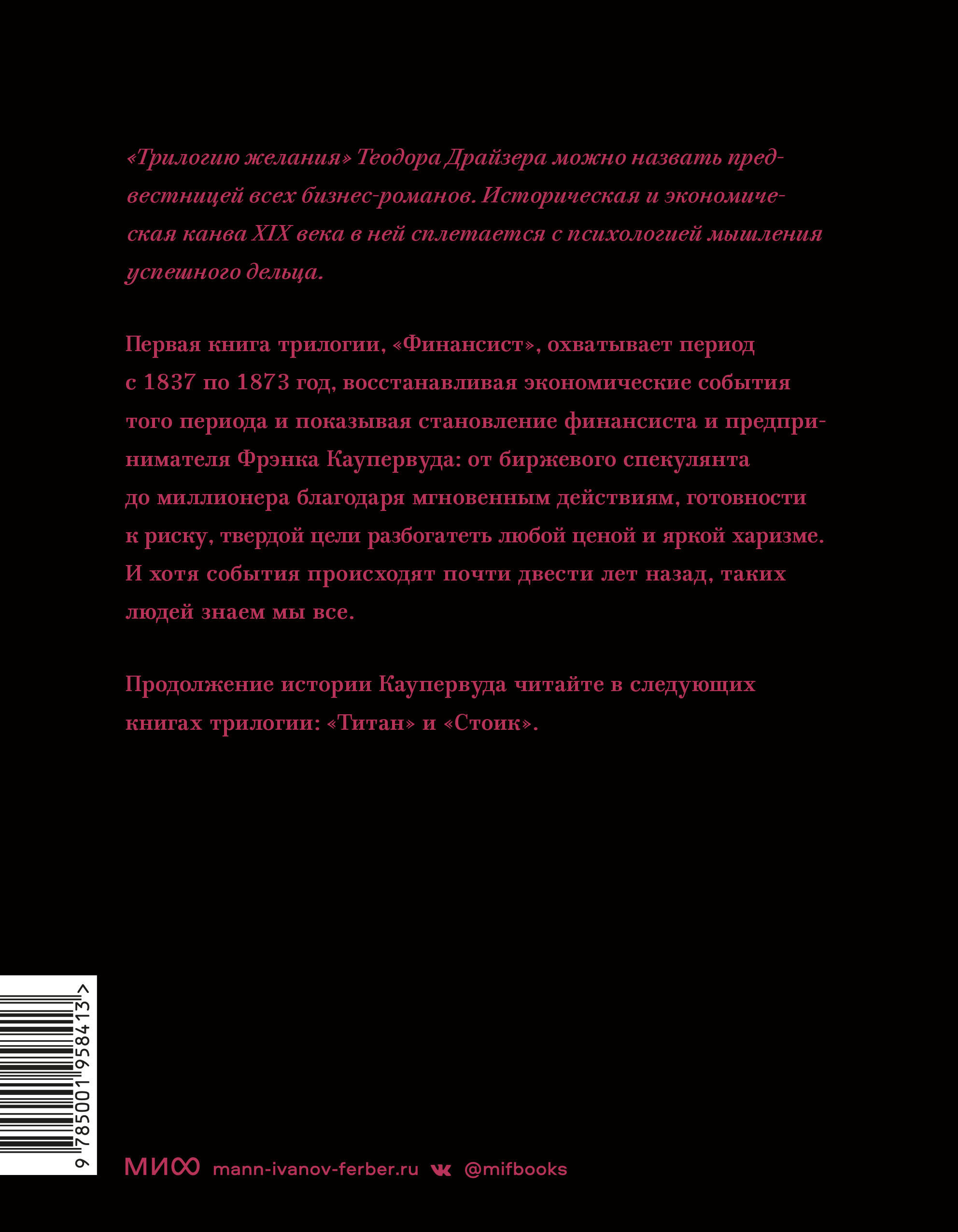 Знаменитый роман американского писателя Теодора Драйзера, опубликованный в 1912 году. Основан на реальной истории американского миллионера Чарльза Йеркса. "Трилогию желания" Теодора Драйзера можно назвать предвестницей всех бизнес-романов. Историческая и экономическая канва XIX века в ней сплетается с психологией мышления успешного дельца. Драйзер показывает, как финансово-экономическая среда формирует психологию коммерсанта и биржевого дилера, для которого все средства хороши, если они помогают достичь власти и богатства. Автор рисует быт и нравы финансовой среды, подход крупного бизнеса к обществу и его политическую несентиментальность. Первая книга трилогии, "Финансист", охватывает период с 1837 по 1873 год, восстанавливая экономические события того периода и показывая становление финансиста и предпринимателя Фрэнка Каупервуда от биржевого спекулянта до миллионера. Герой добивается успеха благодаря спонтанности, готовности к риску, твердой цели разбогатеть любой ценой и яркой харизме. И хотя события происходят почти двести лет назад, таких людей знаем мы все. Для кого эта книга: Для тех, кто любит историко-экономические темы. Для тех, кто хочет вникнуть в мышление капиталиста. Для тех, кто собирает домашнюю или офисную библиотеку.| Издательство | МАНН, ИВАНОВ И ФЕРБЕР ООО |
