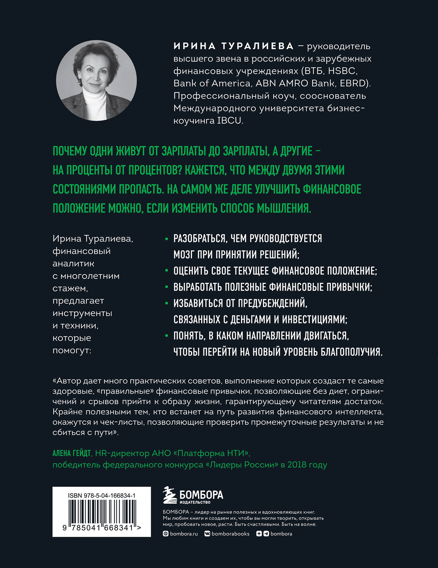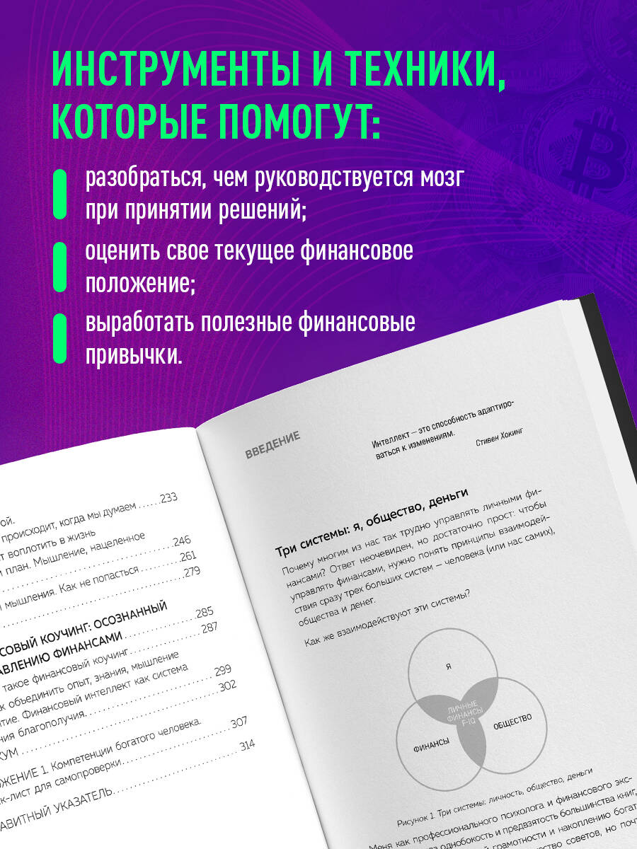 Почему одни живут от зарплаты до зарплаты, а другие - на проценты от процентов? Кажется, что между двумя этими состояниями пропасть. На самом же деле улучшить финансовое положение можно, если изменить способ мышления. Ирина Туралиева, финансовый аналитик с многолетним стажем, предлагает инструменты и техники, которые помогут: • разобраться, чем руководствуется мозг при принятии решений; • оценить свое текущее финансовое положение; • выработать полезные финансовые привычки; • избавиться от предубеждений, связанных с деньгами и инвестициями; • понять, в каком направлении двигаться, чтобы перейти на новый уровень благополучия. Ирина Туралиева - руководитель высшего звена в российских и зарубежных финансовых учреждениях (ВТБ, HSBC, Bank of America, ABN AMRO Bank, EBRD). Профессиональный коуч, сооснователь Международного университета бизнес-коучинга IBCU. «Очень хочется заглянуть в завтрашний день и получить гарантированный "рецепт" стабильности и успешности. Книга не отвечает на вопрос "Куда вкладывать деньги, чтобы больше никогда не работать". Она дает гораздо больше - возможность пересмотреть и изменить свое мышление, а вместе с ним и свое финансовое положение». - Екатерина Баркова, автор книги «Как говорить, чтобы покорить. Клиентов, партнеров, начальника, подписчиков, поклонников» «Читая книгу, обретаешь ощущение, что "все в моих руках". Это вдохновляет растить большие цели, составлять финансовый план и строить свое финансовое благополучие здесь и сейчас». - Светлана Кузнецова, профессиональный аудитор и коуч «В нынешнем BANI-мире уходят в прошлое когда-то привычные для нас методы управления финансами. Для того, чтобы уметь стабильно зарабатывать, необходимо развивать свое финансовое мышление. В книге автор выделяет важные аспекты финансового интеллекта, объясняет его суть, делится своим жизненным и профессиональным опытом, предлагает практические инструменты. Современный человек, понимая и используя эти знания, может изменить свой способ мышления и создать собственный путь к финансовому процветанию». - Зауре Нурова, специалист в области финансового консалтинга и управления персоналом, профессиональный коуч