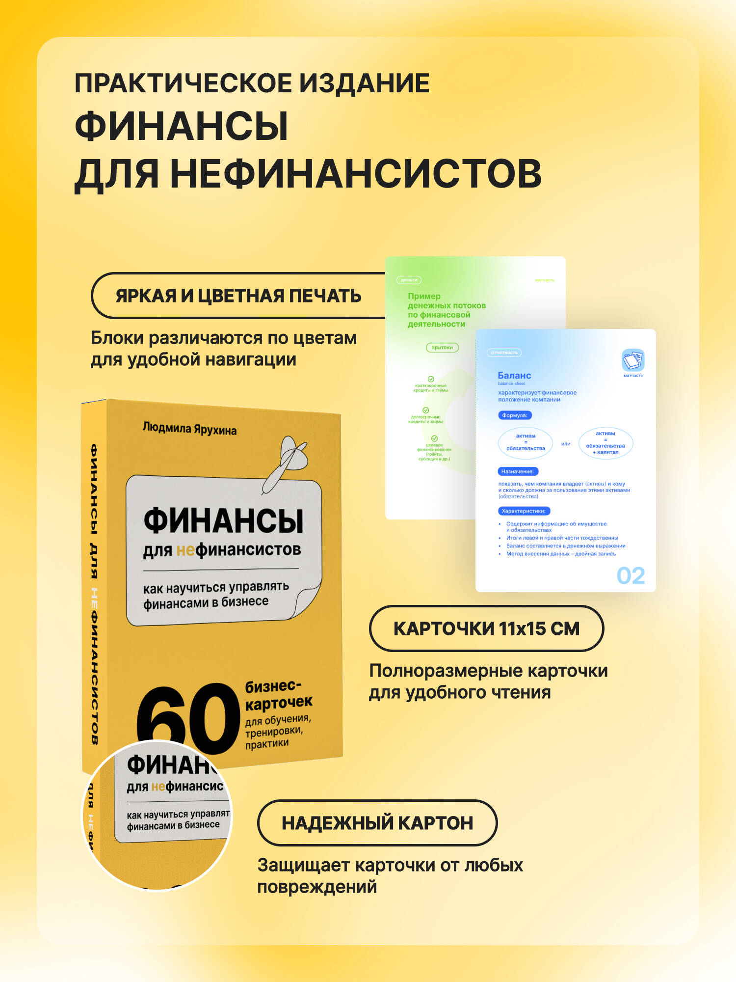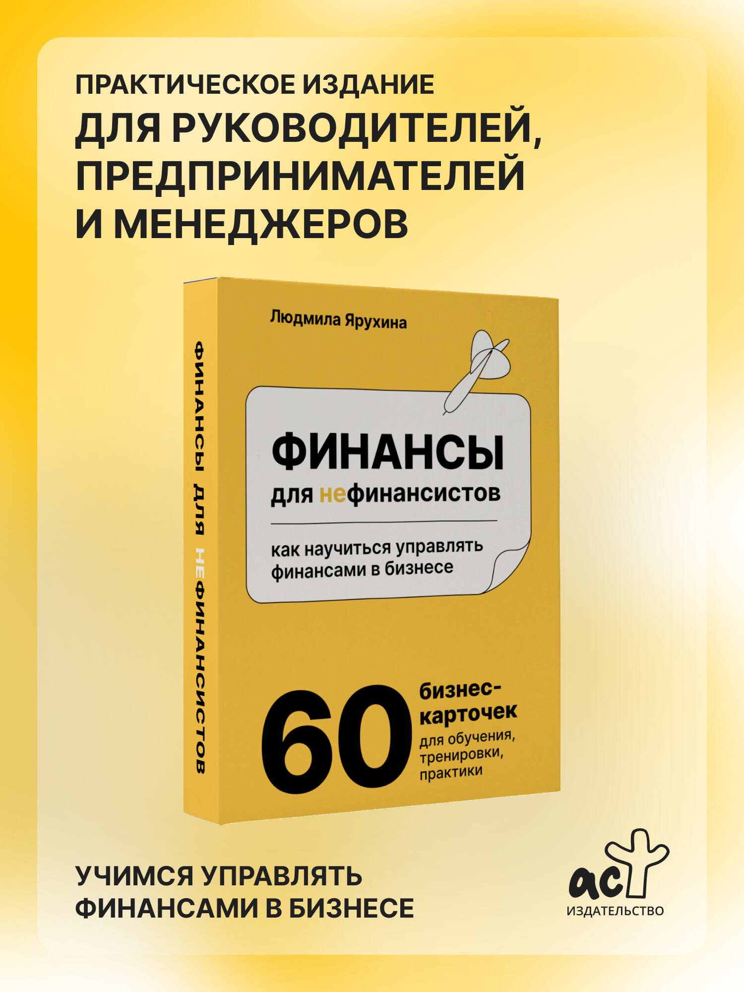 Практическое издание по бизнесу и экономике от автора экономического бестселлера "Финансы для нефинансистов". Людмила Ярухина - финансовый эксперт, бизнес-тренер, преподаватель MBA и CFO более 20 лет. Директор дистанционного обучения FinCourse. Людмила Ярухина разработала уникальные карточки с матчастью, теорией и практическими заданиями. Внутри - пять ключевых блоков для понимания финансов: диагностика, деньги, финансовая отчётность, оборотный капитал и прибыль. Эти блоки помогут разобраться в финансах компании предпринимателям, менеджерам и руководителям.| Издательство | Издательство "АСТ" |