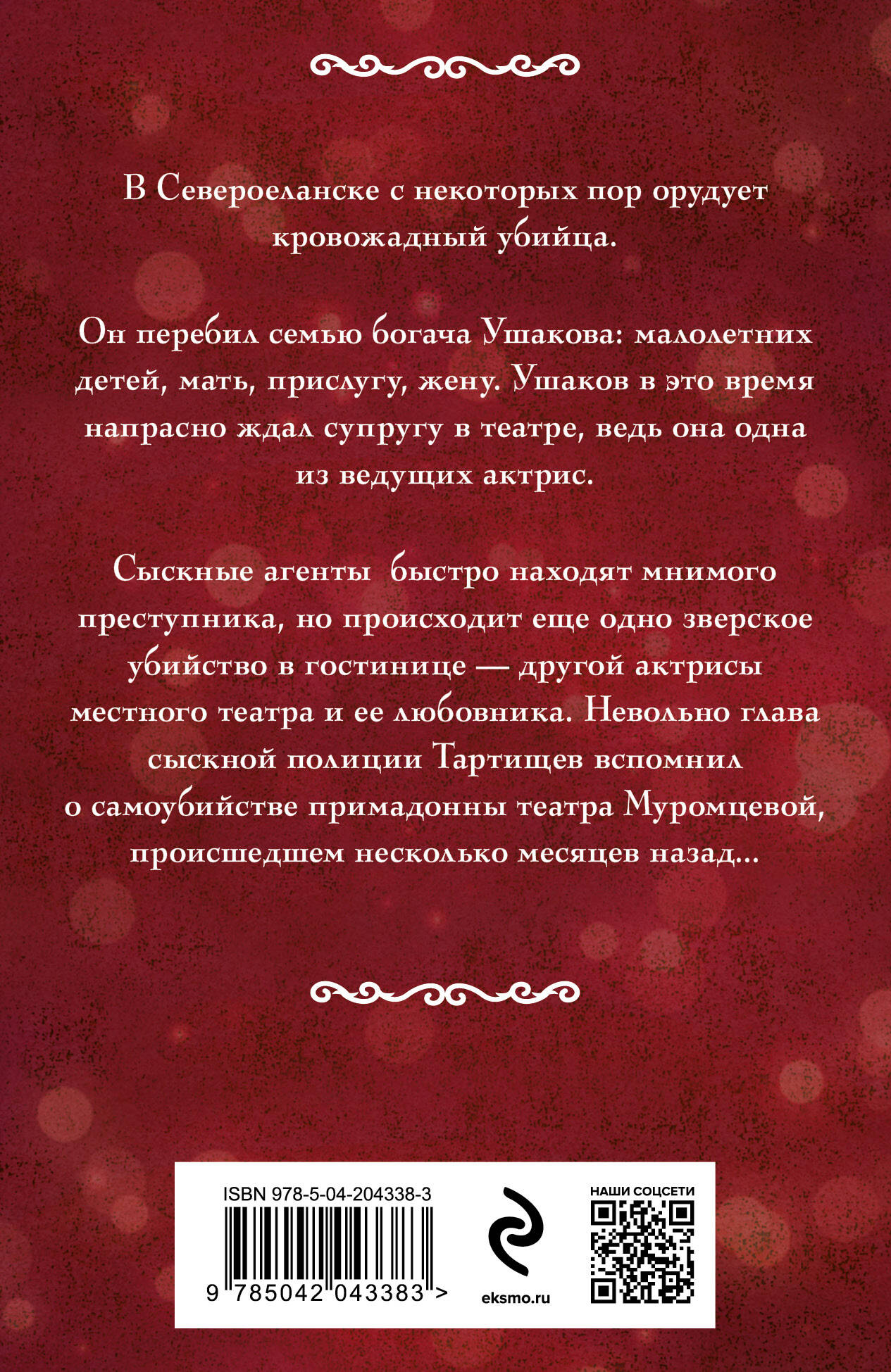 В Североеланске с некоторых пор орудует кровожадный убийца. Он перебил семью богача Ушакова: малолетних детей, мать, прислугу, жену. Ушаков в это время напрасно ждал супругу в театре, ведь она одна из ведущих актрис. Сыскные агенты быстро находят мнимого преступника, но происходит еще одно зверское убийство в гостинице - другой актрисы местного театра и ее любовника. Невольно глава сыскной полиции Тартищев вспомнил о самоубийстве примадонны театра Муромцевой, произошедшем несколько месяцев назад...| Издательство | ООО "Издательство "Эксмо" |