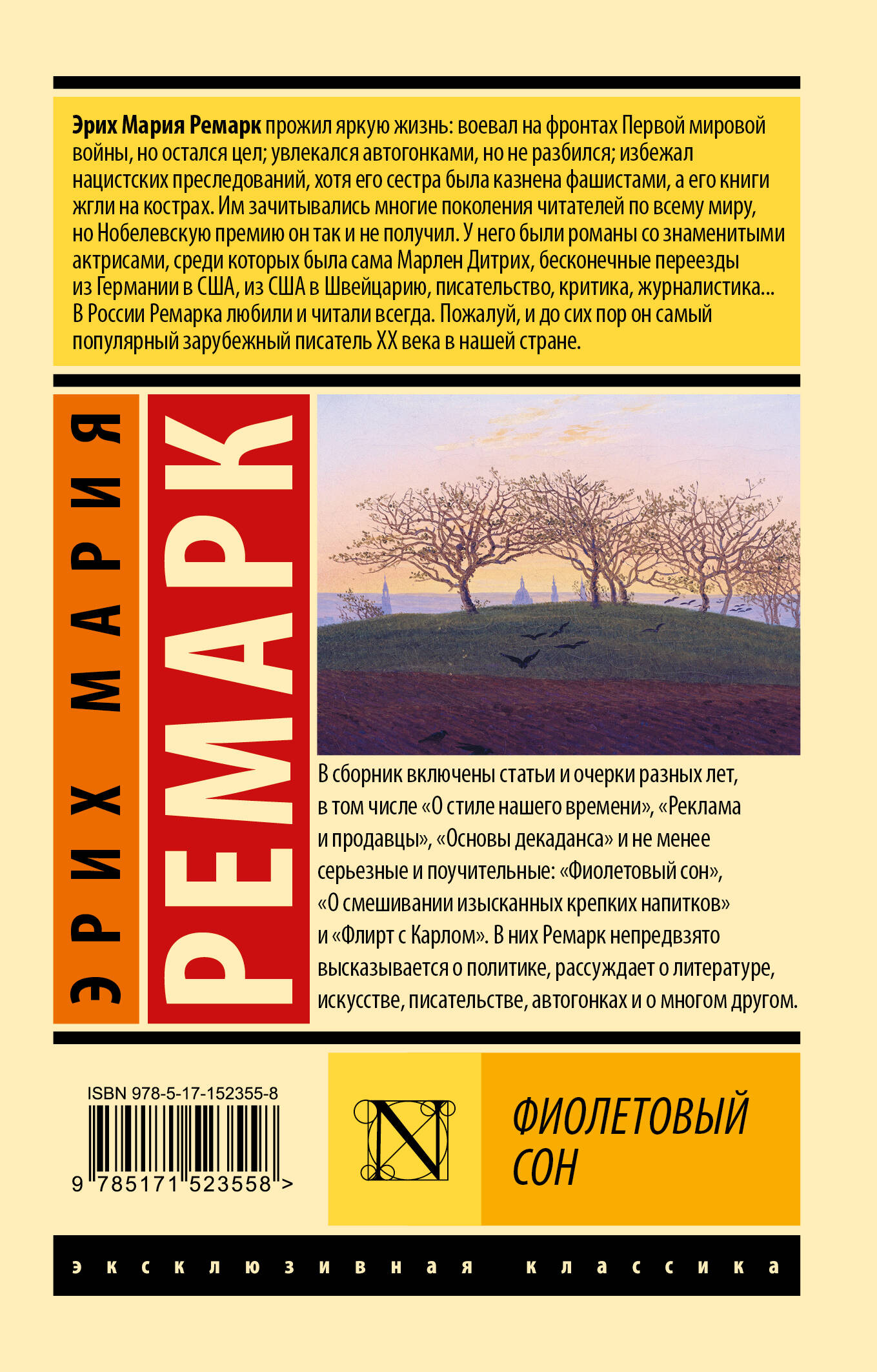 В сборник включены статьи и очерки разных лет, в том числе "О стиле нашего времени", "Реклама и продавцы", "Основы декаданса", и не менее серьезные и поучительные: "Фиолетовый сон", "О смешивании изысканных крепких напитков" и "Флирт с Карлом". В них Ремарк непредвзято высказывается о политике, рассуждает о литературе, искусстве, писательстве, автогонках и о многом другом.| Издательство | ИЗДАТЕЛЬСТВО "АСТ" |