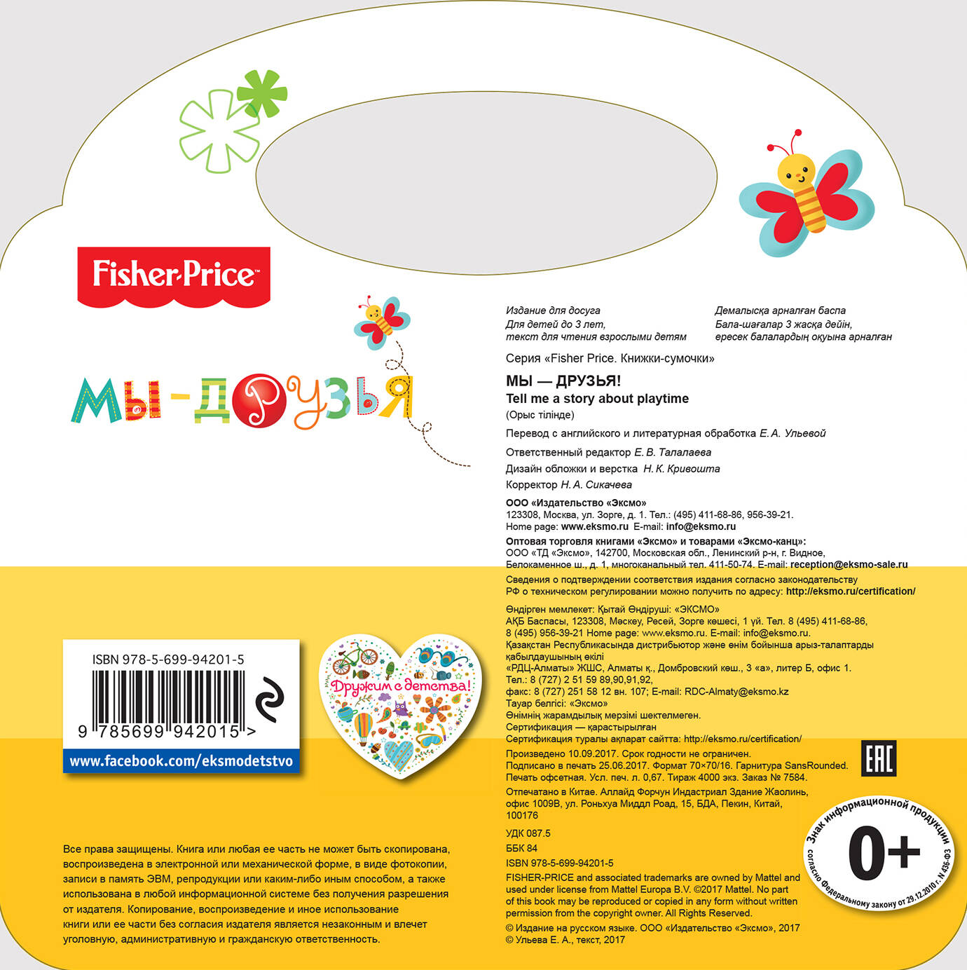 Тема развития речи ребенка раннего возраста очень актуальна. Чистая и четкая речь малыша приобретается благодаря усилиям взрослых людей, в окружении которых ребенок растет. Вот почему очень важно постоянно читать детям книги. Специально для малышей мы создали серию замечательных книжек-сумочек на картоне с любимыми зверушками Fisher Price и веселыми стихами.| Издательство | ООО "Издательство "Эксмо" |