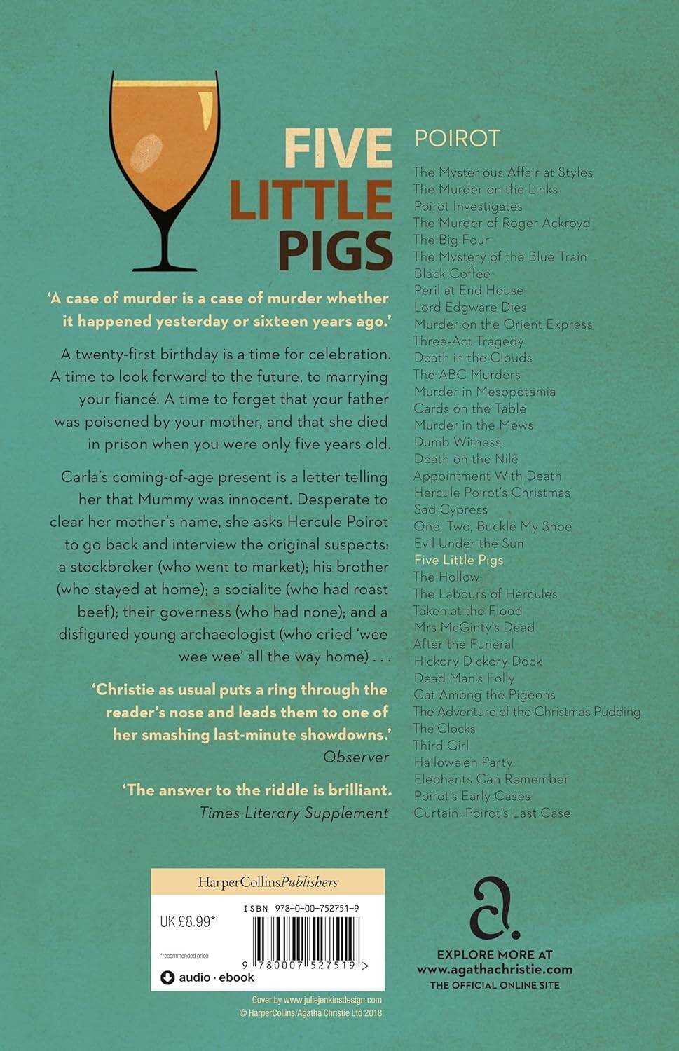 Five little pigs (Agatha Christie) Agatha Christie's ingenious murder mystery, reissued with a striking new cover designed to appeal to the latest generation of Agatha Christie fans and book lovers. Beautiful Caroline Crale was convicted of poisoning her husband, yet there were five other suspects: Philip Blake (the stockbroker) who went to market; Meredith Blake (the amateur herbalist) who stayed at home; Elsa Greer (the three-time divorcee) who had roast beef; Cecilia Williams (the devoted governess) who had none; and Angela Warren (the disfigured sister) who cried 'wee wee wee' all the way home. It is sixteen years later, but Hercule Poirot just can't get that nursery rhyme out of his mind… Пять поросят (Агата Кристи) Гениальная тайна убийства от Агаты Кристи, переизданная с новой поразительной обложкой, призванной привлечь внимание последнего поколения поклонников и книголюбов Агаты Кристи. Прекрасная Кэролайн Крейл была осуждена за отравление своего мужа, в то время как было еще пятеро подозреваемых: Филип Блейк (биржевой маклер), который пошел на рынок; Мередит Блейк (травник-любитель), которая осталась дома; Эльза Грир (трижды разведенная), которая ела ростбиф; Сесилия Уильямс (преданная гувернантка); и Анджела Уоррен (изуродованная сестра), которая кричала "пи-пи-пи" всю дорогу домой. Прошло шестнадцать лет, а Эркюль Пуаро никак не может выкинуть из головы этот детский стишок… агата кристи, детективы агаты кристи, эркюль пуаро| Издательство | Harper Collins Publishers Ltd |