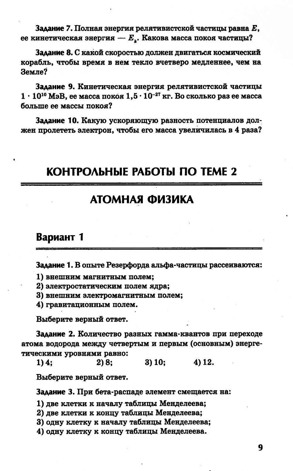 Физика: контрольные работы: элементы теории относительности. Атомная физика. 10-11 классы