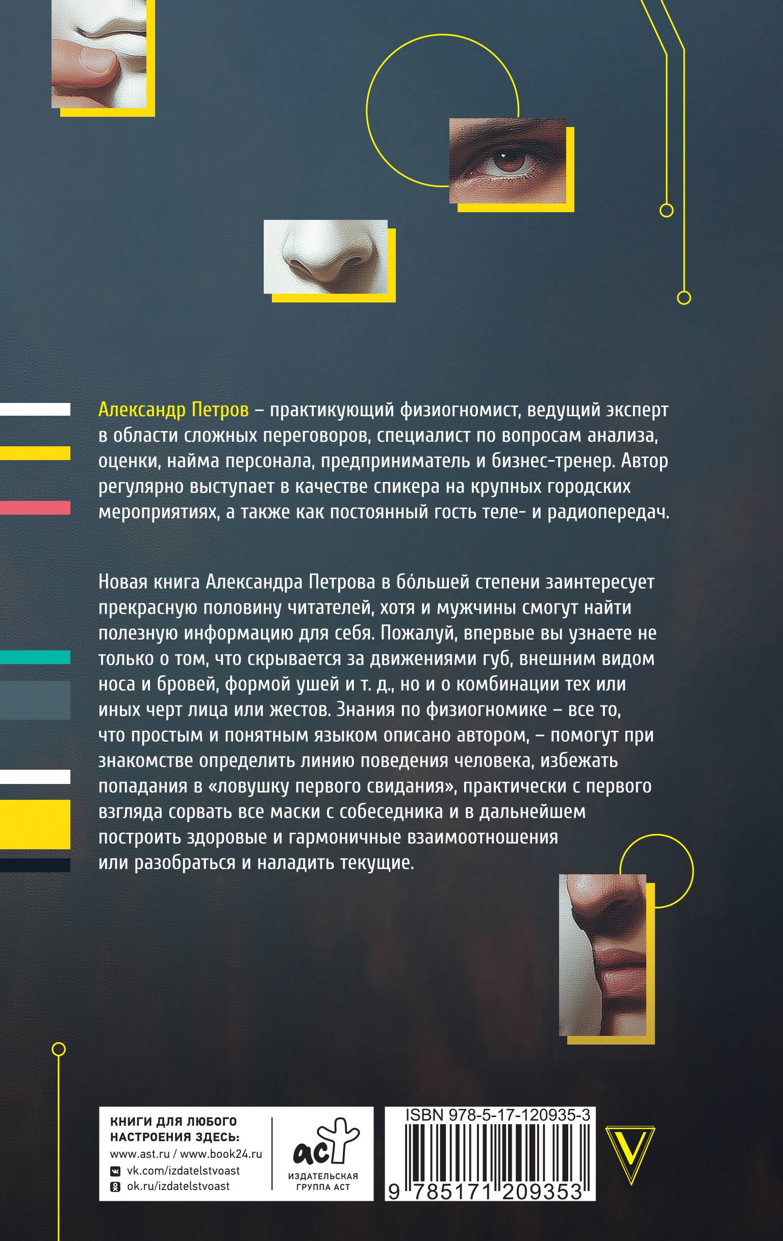 Новая книга Александра Петрова по физиогномике в большей степени заинтересует прекрасную половину читателей, хотя и мужчины смогут найти полезную информацию для себя. Пожалуй, впервые вы узнаете не только о том, что скрывается за движениями губ, внешним видом носа и бровей, формой ушей и т.д., а узнаете о комбинации тех или иных черт лица или жестов. Знания по физиогномике - все то, что простым и понятным языком описано автором - помогут при знакомстве определить линию поведения человека, избежать попадания в "ловушку первого свидания", практически с первого взгляда сорвать все маски с собеседника и в дальнейшем построить здоровые и гармоничные взаимоотношения или разобраться и наладить текущие.