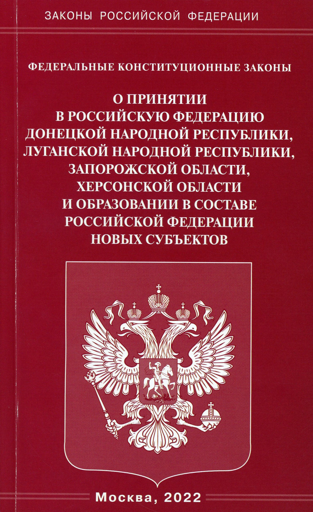 Донецкая Народная Республика принимается в Российскую Федерацию в соответствии с Конституцией Российской Федерации и статьей 4 Федерального конституционного закона от 17 декабря 2001 года № 6-ФКЗ «О порядке принятия в Российскую Федерацию и образования в ее составе нового субъекта Российской Федерации». Основаниями принятия в Российскую Федерацию Донецкой Народной Республики являются: 1) Декларация о суверенитете Донецкой Народной Республики от 7 апреля 2014 года, Акт о провозглашении государственной самостоятельности Донецкой Народной Республики от 7 апреля 2014 года и результаты референдума, состоявшегося в Донецкой Народной Республике 11 мая 2014 года; 2) результаты референдума, который состоялся в Донецкой Народной Республике 27 сентября 2022 года, на котором поддержан вопрос о вхождении Донецкой Народной Республики в состав Российской Федерации на правах субъекта Российской Федерации; 3) предложение Донецкой Народной Республики о ее принятии в Российскую Федерацию; 4) Договор между Российской Федерацией и Донецкой Народной Республикой о принятии в Российскую Федерацию Донецкой Народной Республики и образовании в составе Российской Федерации нового субъекта; 5) настоящий Федеральный конституционный закон. Донецкая Народная Республика считается принятой в Российскую Федерацию с даты подписания Договора между Российской Федерацией и Донецкой Народной Республикой о принятии в Российскую Федерацию Донецкой Народной Республики и образовании в составе Российской Федерации нового субъекта.| Издательство | Омега-Л |