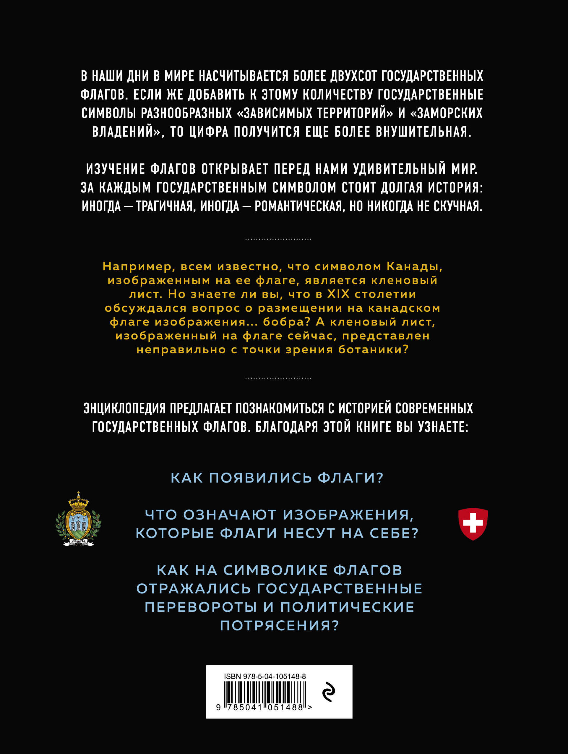 Взрослым и детям любого возраста будет интересно узнать о красочных флагах мира, интересных фактах о странах и проверить свои познания в географии. Изучение флагов открывает перед нами удивительный мир. За каждым государственным символом стоит долгая история: иногда - трагичная, иногда - романтическая, но никогда не скучная. Например, всем известно, что символом Канады, изображенным на ее флаге, является кленовый лист. Но знаете ли вы, что в XIX столетии обсуждался вопрос о размещении на канадском флаге изображения... бобра? А кленовый лист, изображенный на флаге сейчас, представлен неправильно с точки зрения ботаники? Энциклопедия предлагает познакомиться с историей современных государственных флагов. Как они появились? Что означают изображения, которые они несут на себе? Как отражались на них государственные перевороты и политические потрясения?| Издательство | ООО "Издательство "Эксмо" |